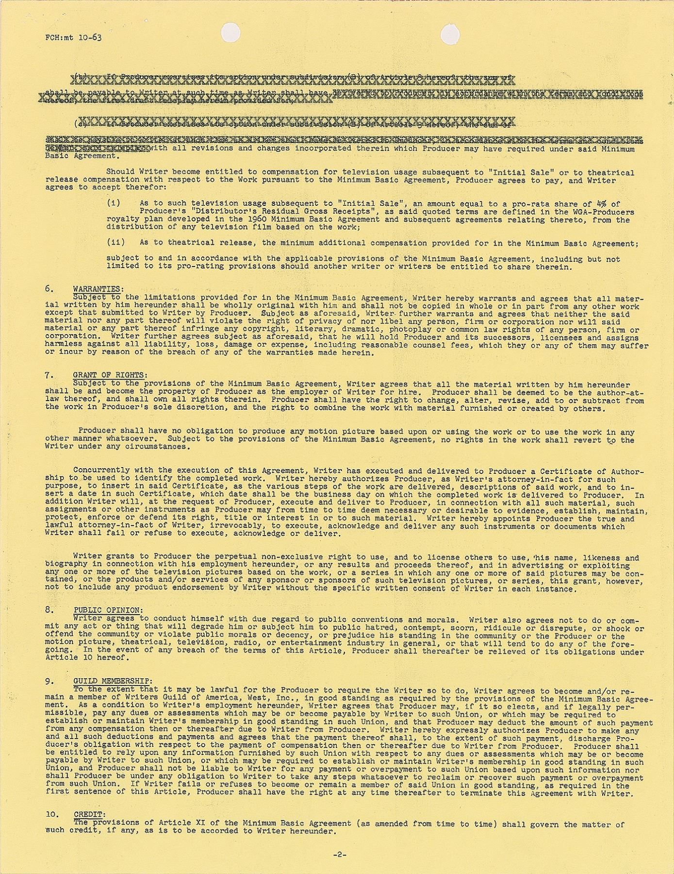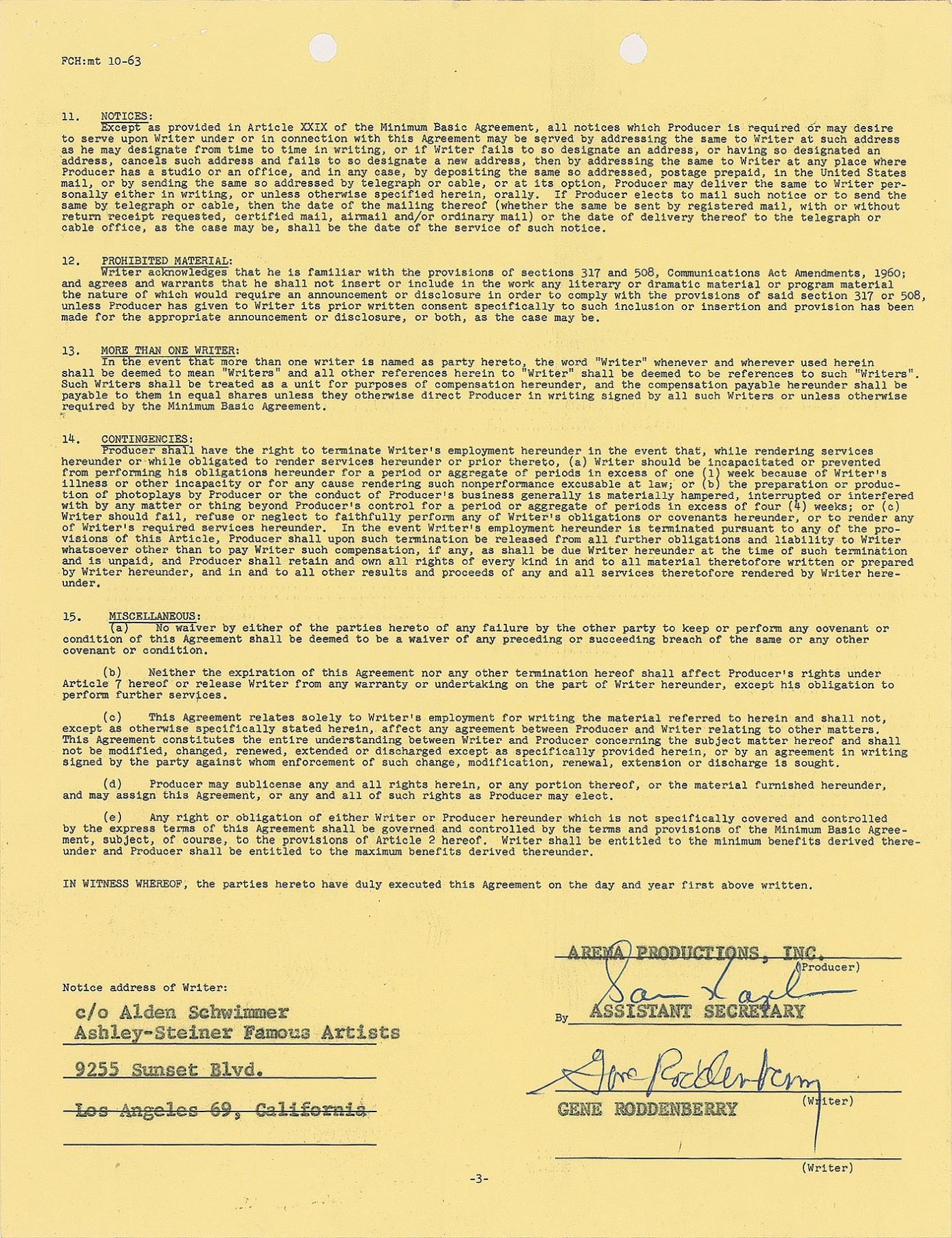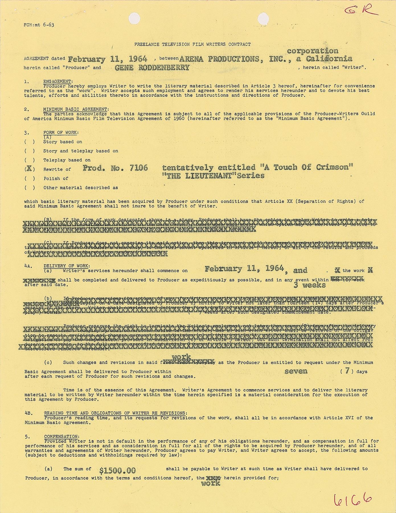 DS, three pages, 8.5 x 11, February 11, 1964. Freelance Television Film Writer's contract between Roddenberry and Arena Productions, Inc., in which the former agrees to perform a rewrite of "Prod. No. 7106 tentatively entitled 'A Touch of Crimson,'" a story for "The Lieutenant" series, for the sum of $1,500. Neatly signed on the last page in blue ballpoint Roddenberry. In fine condition. After writing freelance for shows like Highway Patrol and Have Gun–Will Travel, Roddenberry created and produced his own television series entitled The Lieutenant in 1963. Starring Gary Lockwood and Robert Vaughn, the show focused on Marines situated at Camp Pendleton during Cold War peace time. Despite earning strong reviews and viewership, the show was canceled after one 29-episode season; Roddenberry's second television series, Star Trek, would premiere in 1966, and include several members of The Lieutenant cast, which included Leonard Nimoy, Nichelle Nichols, Walter Koenig, and Majel Barrett.