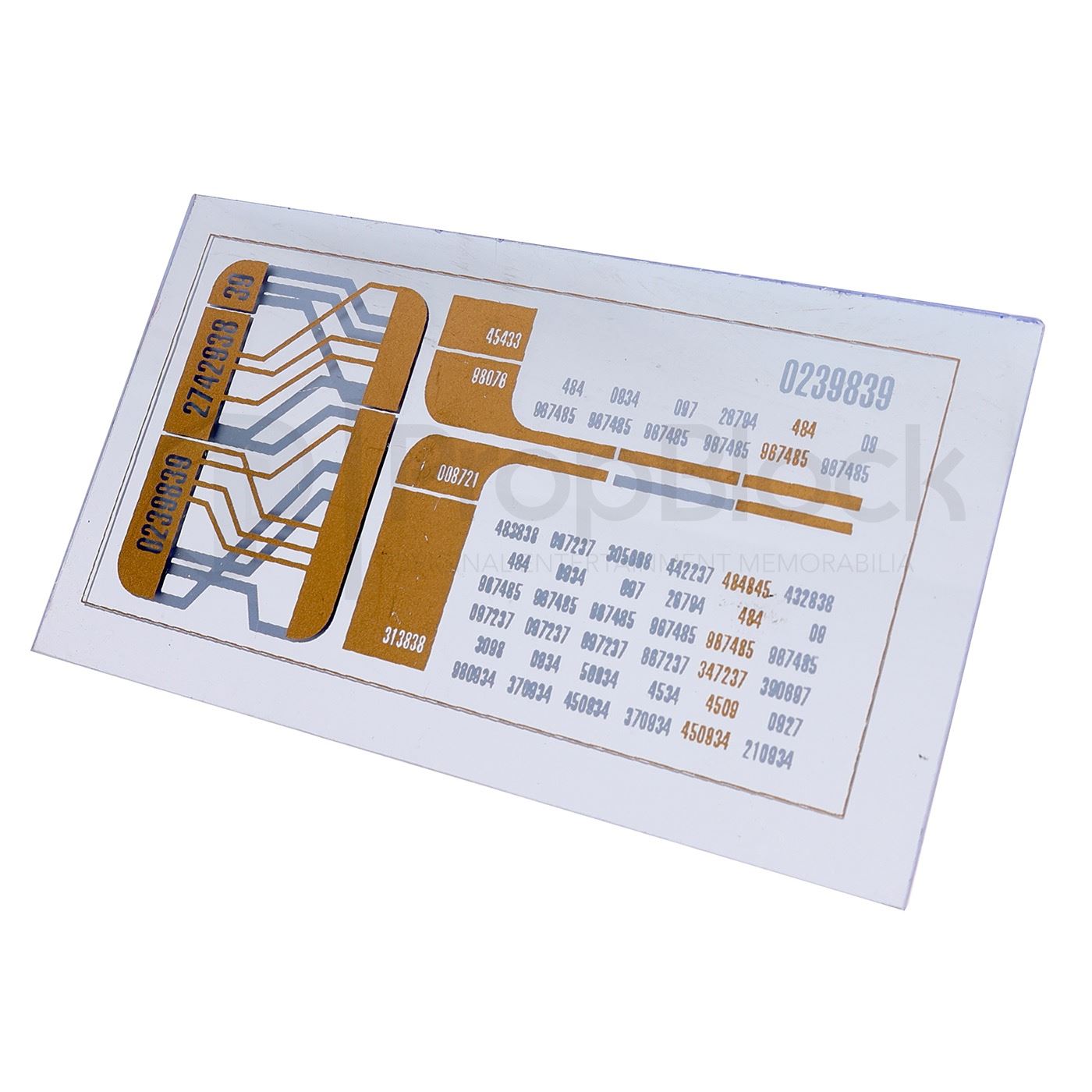 Blue isolinear chip used in the production TNG cast's first feature film Star Trek: Generations. In the 23rd century, the Starship Enterprise is dispatched to the scene of a giant energy field about to engulf two ships. Capt. Kirk (William Shatner) averts calamity, but is exposed to the field and presumed dead. Years later, the Enterprise's new commander, Capt. Picard (Patrick Stewart), learns that one of the disaster's survivors, Dr. Soran (Malcolm McDowell), plans to enter the field by destroying a neighboring star. Picard now must collaborate with an unlikely ally in order to stop him. This is small blue rectangular ISO chip made of tinted acrylic with silkscreened detailing printed on the front and back. This item shows very minor wear from use in the film and remains in excellent condition.