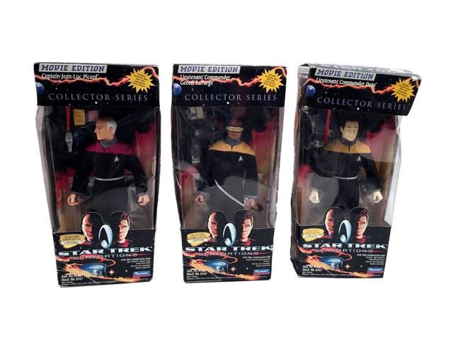 Star Trek Generations 'Playmates' Collector Series Movie Edition action figures including Captain Jean-Luc Picard, Lieutenant Commander Geordi LaForge, and Lieutenant Commander Data. All in original boxes. (approx. 12" x 6" each)