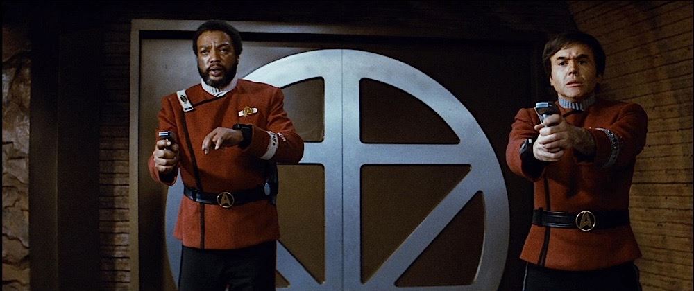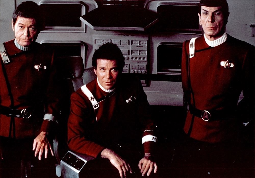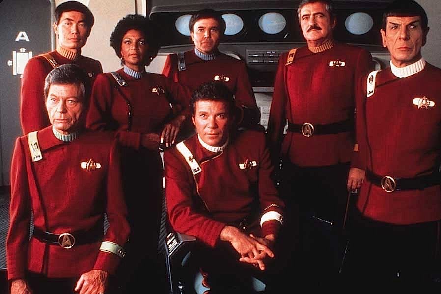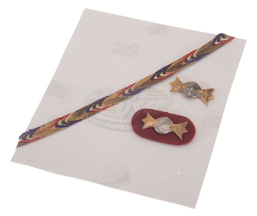 (Paramount, 1982) This set of pins and ribbon were custom-made by the production for use by various actors during filming. The set includes two rank pins, one on a maroon backing for the left sleeve and another for the shoulder strap and a multi-color ribbon for the left sleeve. The metal pins measure 2.25" x 1.25", 1.75" x .75" and the ribbon measures 15" x .5".