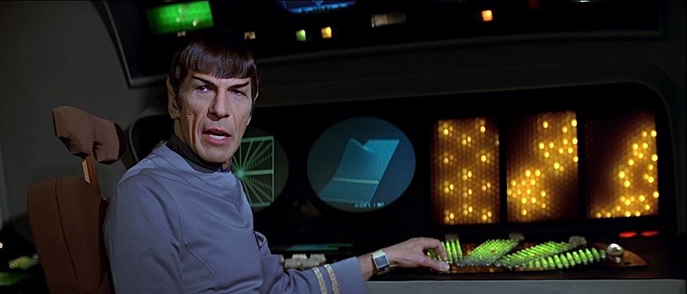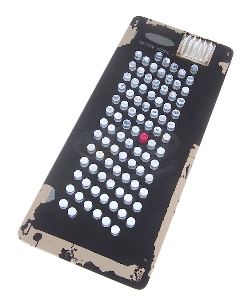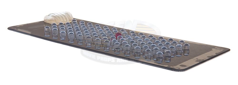 (Paramount, 1982) This Enterprise bridge panel was custom-made by the production for use as set dressing. Constructed of plexiglass with numerous clear plastic knobs, the panel is designed to be back-lit during filming. Measures 14" x 6". Panels like these were also used in various areas of the Enterprise in the first film, Star Trek: The Motion Picture (1979). A very rare piece of the iconic Starship "Enterprise".