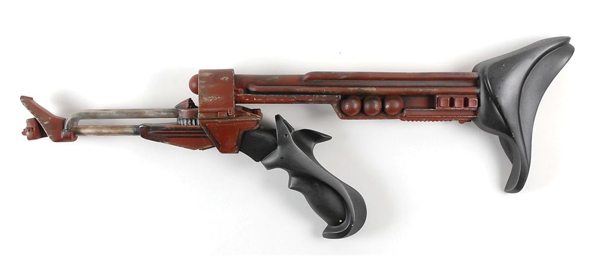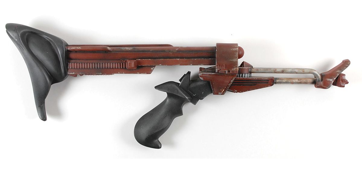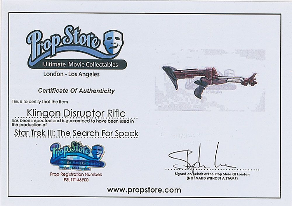 A Klingon disruptor rifle used on-screen in the 1984 film Star Trek III: The Search for Spock. The cast resin rifle measures 26? long, and is painted maroon, with a metallic gray barrel, and ergonomically-shaped grip and shoulder stock. Accompanied by a certificate of authenticity from the Prop Store which states this “Klingon Disruptor Rifle has been inspected and is guaranteed to have been used in the production of Star Trek III: The Search for Spock.” In fine, intentionally distressed condition. An intimidating weapon, synonymous with the battle-hungry Klingons and a very rare opportunity to own one.