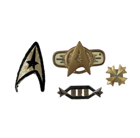 Star Trek insignia and pins from the collection of the William Ware Theiss, the Costume Designer for Star Trek (1966-1969) and Star Trek: The Next Generation (1987-1993). Command Division patch with elongated black star worn by Captain Kirk and all officers in Season 1 of the original Star Trek TV show (1966-1969), Star Trek pin used in the second through seventh Star Trek films, Star Trek metal insignia used on uniforms in movies such as Star Trek II: The Wrath of Khan (1982), and small gold Starfleet uniform patch. These are all replicas from the Lincoln Enterprises store started by Gene Roddenberry's wife, Majel Barrett, to offer Star Trek memorabilia to its many fans: http://www.strangenewworlds.com/issues/feature-10.htm. Largest item is approx. 2" x 3".