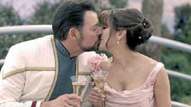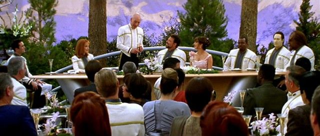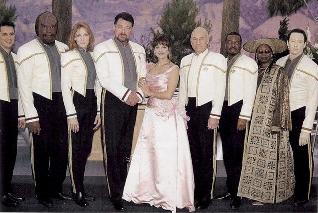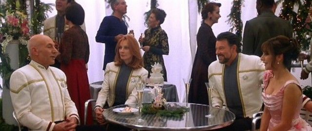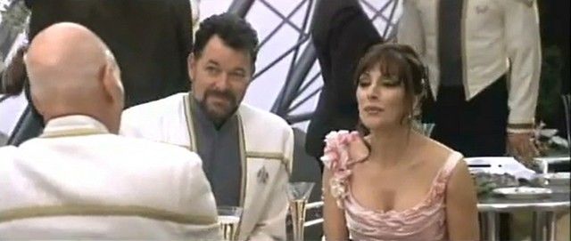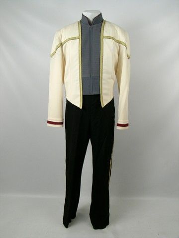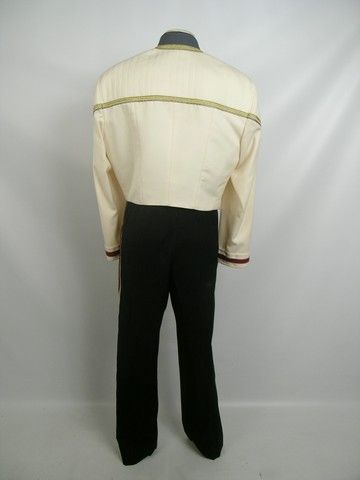 In the first few scenes of “Star Trek” – Nemesis"” (1998), we see the festive wedding of Commander William T. Riker (Jonathan Frakes) to Counselor Diana Troy (Marina Sirtis). Ricker looks especially festive out of his usually Red Rank Uniform and wearing "dress whites". The mood however is dampened when Jean-Luc Picard (Patrick Stewart) "toast" turns out to be a bit more upsetting than moving, as he reveals that Riker is being transferred to Captain of the USS Titan. This is Riker's screen worn "dress white" coat and pants. The coat has an embroidered "J" inside, and the pants have a generic label with "Jonathan" and "Size 39W/34" written in. Coat is missing the communicator. Crew members and independent collectors have verified the authenticity of this item. Comes with a COA from Premiere Props.