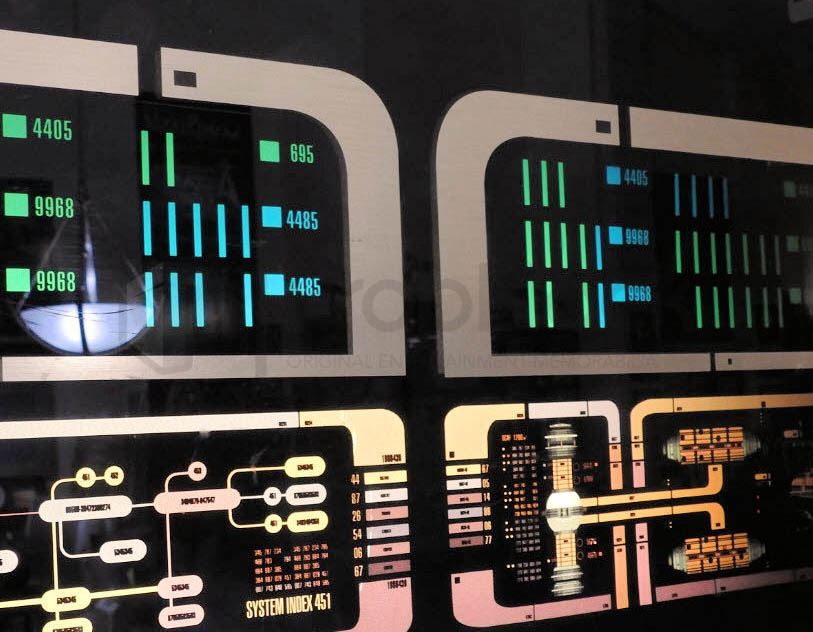 Large LCARS display used in the production of Star Trek: Insurrection. These types of displays were used all around the Federation Starships as interfaces to the main computer. This piece was a part of the shuttlecraft engineering set and features diagnostic information on the ship and the warp core. This item is made of smoked acrylic and remains in excellent, production used condition. Item measures 54" x 17".