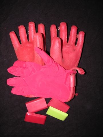 Star Trek: Insurrection (1998) - A set of production made gloves for the opening scene cast in red rubber. A right and left hand. Also included are 4 belt and costume pieces. Also includes a single cloth glove with rubber around the wrist. 11" x 5" x 5"