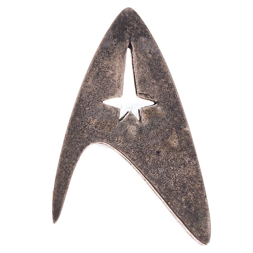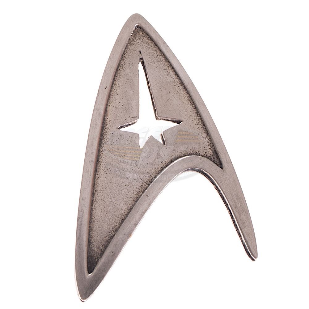 (Paramount Pictures, 2013) This Starfleet uniform chest insignia was custom-made for use by various actors during filming. The iconic insignia is made of metal and measures 2" x 1.25". Two sided tape was applied to the backside for attaching to the costume during filming.