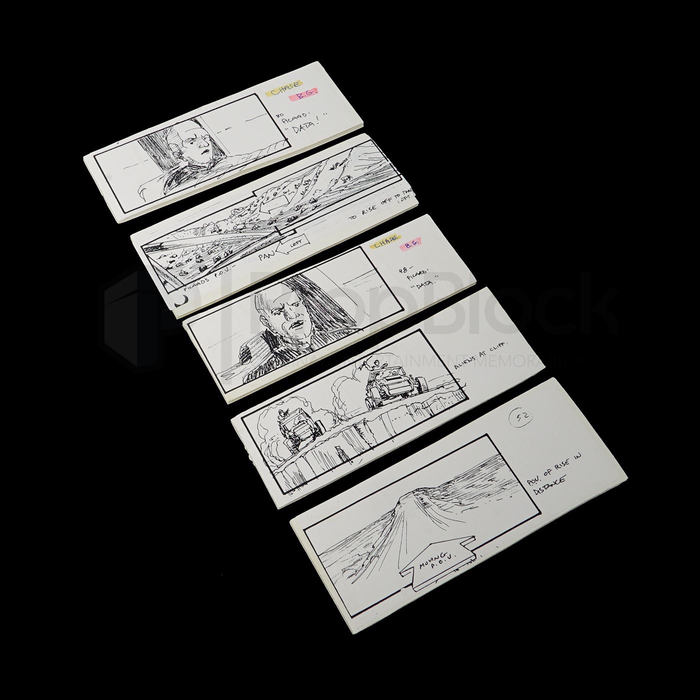 Collection of plotted storyboard panels used in the production of the 2002 feature film Star Trek: Nemesis. Capt. Jean-Luc Picard (Patrick Stewart) diverts the starship Enterprise from its scheduled trip to Cmdr. Riker (Jonathan Frakes) and Counselor Troi's (Marina Sirtis) wedding to negotiate a peace treaty with the Romulans. Picard is shocked when Shinzon (Tom Hardy), the new Praetor of the Romulans, admits to being a clone of him. When the crew members discover a break-in on their computer, they are forced into a life-or-death battle to stop Shinzon's Warbird before it can destroy the Earth. This set features five hand drawn images plotted for the films chase sequence featuring Picard and Data. Each piece is hand drawn on a rectangular section of foam core with highlighted notes. This set remains in excellent, production used condition.