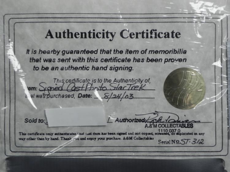 This print was signed by 11 original cast members of the 2002 sci-fi adventure "Star Trek Nemesis." The autographs are all in silver paint pen. They include Patrick Stewart (Jean-Luc Picard), Jonathan Frakes (William Ryker), LeVar Burton (Geordi La Forge), Michael Dorn (Worf), Gates McFadden (Beverly Crusher), Marina Sirtis (Deanna Troi), and Brent Spiner (Data). The print is 5 1/2 x 8 inches, and the green and gold plastic frame is 9 1/2 x 11 1/2 inches. A signed certificate of authenticity from A & M Collectibles is included on back.