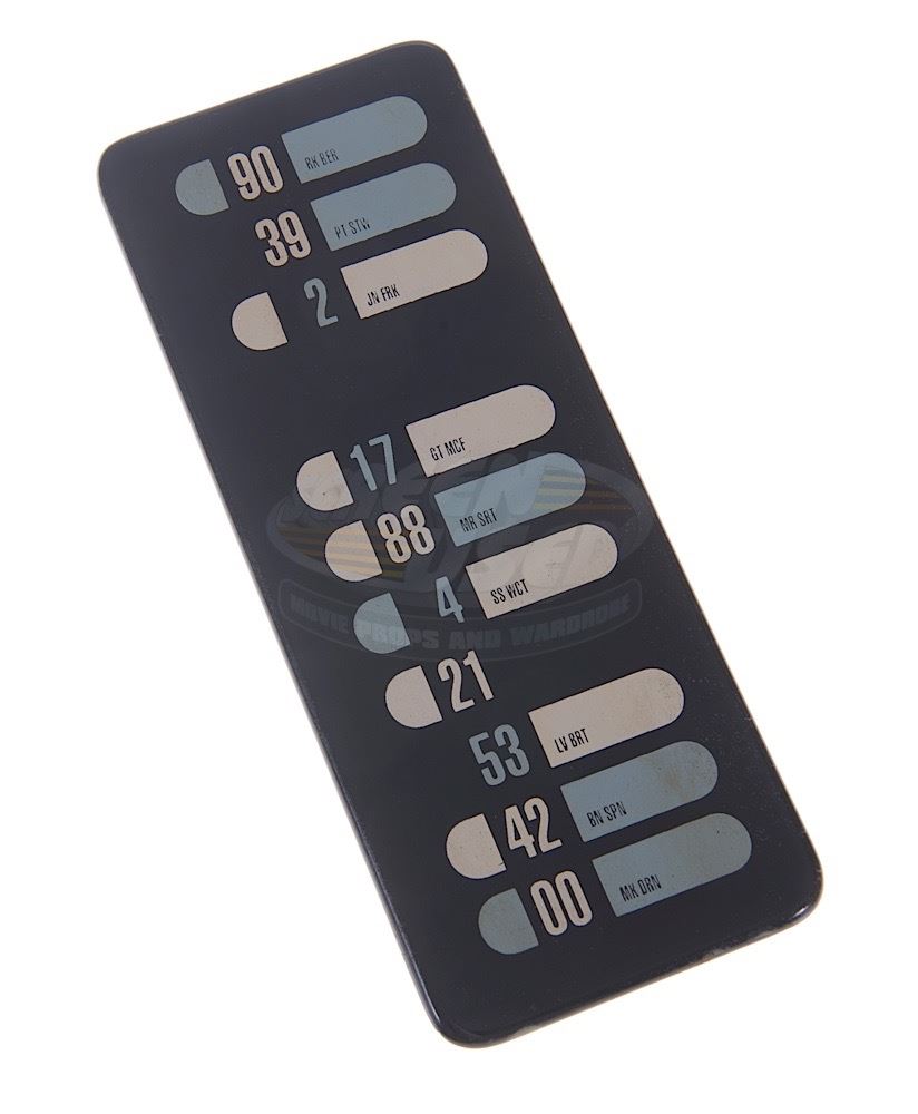 (Paramount Pictures, 2002) This prop wall panel was custom-made by the production for use as set dressing. The panel is made of acrylic with various numbers and buttons printed on one side and strips of Velcro applied to the back. Measures 7.5" x 3".