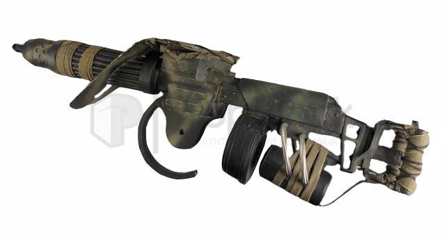 Large rifle used by the Kolarans in the final TNG film Star Trek: Nemesis. This piece can be seen on the back of the buggy's that are chasing Picard, Data and Worf in the beginning of the film. Made of cast resin with metal and plastic detailing, this piece is grey and green in color with brown accents and beige and leather wraps. This item remains in excellent production used condition.