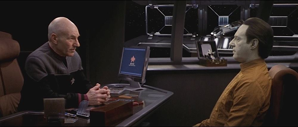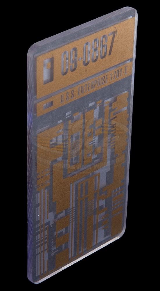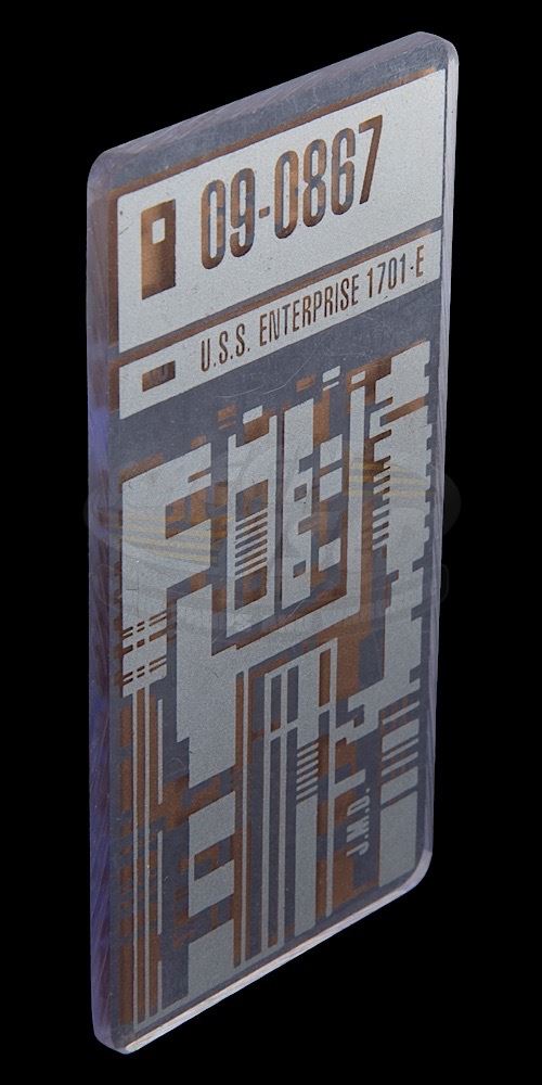 (Paramount Pictures, 2002) This Isolinear optical chip was custom-made by the production for use by various actors and as set dressing. The chip is made of rectangular acrylic and features an etched circuitry pattern on each side, with "U.S.S. Enterprise" ID number along the top. The chip measures 4" x 2" and has minor wear from use.