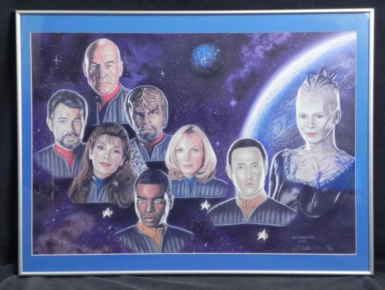 This nice portrait shows the main characters from "Starr Trek: The Next Generation" standing amidst a background of stars and planets. Artist: R.J. Crabtree Signature: In silver paint pen, lower right Title: First Contact Medium Print on paper Edition: 191/500 Year published: 1997 Image size: 15 x 22 inches Framing: Matted in blue, in brushed silver metal frame Condition: Excellent Certificate of Authenticity: Included on back