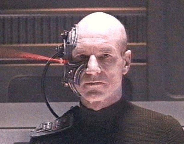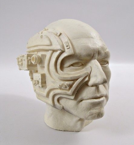Star Trek Next Generation Capt Picard (Patrick Stewart) Locutus Of Borg Life-Head Maquette - Locutus of Borg was the Borg designation forced upon Starfleet Captain Jean-Luc Picard (Patrick Stewart ) after his assimilation in late 2366 in "Star Trek: The Next Generation". The implant allowed the Borg to "download" all of his thoughts his knowledge and vast experiences both professional and personal. Of course this was supposed to all be for "the good of peace", but, nothing is what it seems in their world. This plaster life-head of Picard includes the detailed right-side face implant. It comes from the Stan Winston Studios where it was used both as a maquette and mold. Free standing head is approx 11"x7"x8".