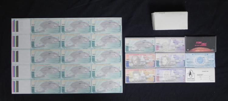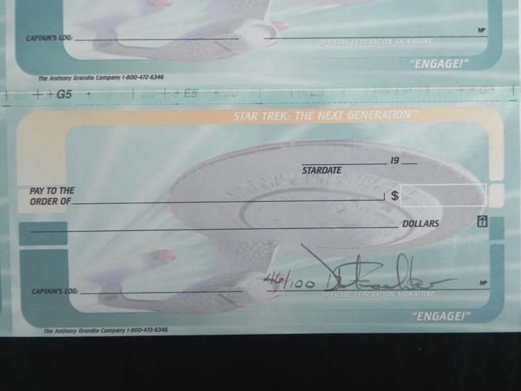 This is a set of Star Trek checks and uncut sheet from the Anthony Gradio Next Generation Series produced in 1996. They are in mint condition, and checks come in the original box. The eight different designs feature original characters, the ship and logo. Also included is a "Captain's Log" sure to inspire you to balance your checkbook. The most inspiring part of this set is an uncut sheet with 15 checks. One check is signed and numbered in pencil. * This is a terrific set of Star Trek Checks, and the uncut sheet is suitable for framing.