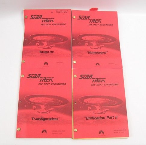 Treasures from LeVar Burton's (Lt. Commander La Forge), personal collection these are four original "Star Trek: The Next Generation" scripts used during production. They include "Ensign Ro" (Season 5/ Episode 3 - aired October 5, 1991); "Homeward" (Season 7/ Episode 13 - aired January 15, 1994); "Transfigurations'" (Season 3/ Episode 25 - aired June 2, 1990); and "Unification II" (Season 5/ Episode 8 - aired November 9, 1991). All are still in their original production "Star Trek: TNG" red script covers.
