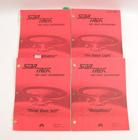 Directly from the personal collection of Lt. Commander Geordi La Froge himself, LeVar Burton, here are four of his production used original scripts from "Star Trek: The Next Generation". They include, "The Inheritance (Season 7/ Episode 10- aired November 20, 1993); "The Inner Light" (Season 5/ Episode 25 - aired May 30, 1992); "Thine Own Self" (Season 7/ episode 16 - aired February 12, 1994); and "Bloodlines" (Season 7/ Episode 22 - aired April 30th, 1994. All are in their original red "Next Generation" script covers.