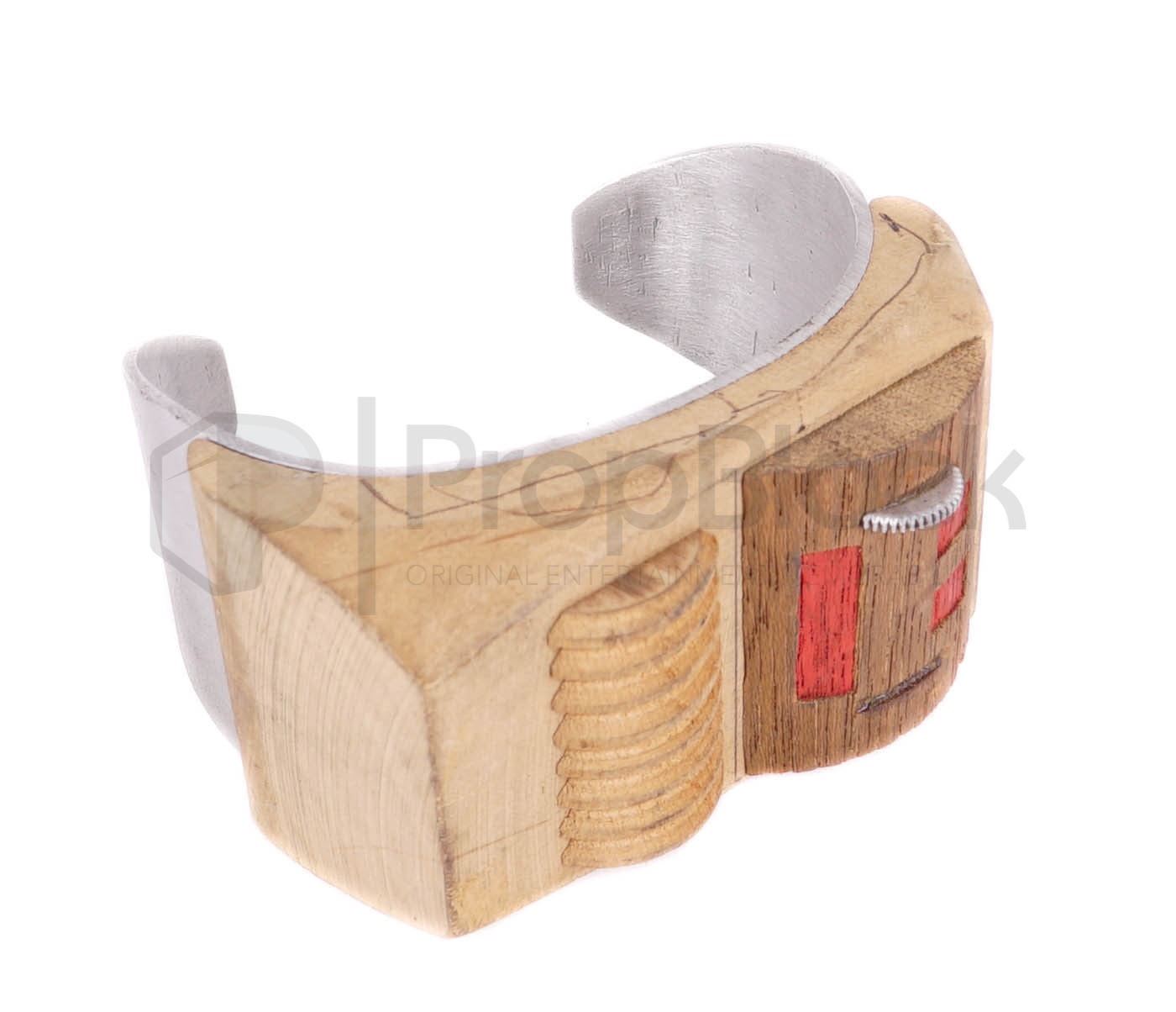 Prototype mock up of the updated wrist communicator made by the production of the proposed original series sequel Star Trek: Phase II. This piece was made by the production as an early version of the communicator, which was changed from the handheld, flip open design of TOS to a wearable wrist version. This piece would eventually be updated and become the wrist communicator as seen in Star Trek: The Motion Picture. Made with a thick silver metal cuff, this piece features a hand carved wooden face section with engraved details. Small vent areas are carved out of wood on the top section, along with small metal gears added to the bottom section, please note one gear detail is missing. This piece comes from the collection of the Star Trek prop master Joe Longo and remains in excellent condition.