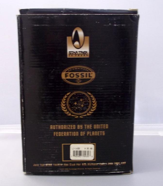 New In Black Box. Authentic Fossil Star Trek Pocket watch Commemorating the Crew of the Star Ship Enterprise NCC-1701. Numbered Limited Edition. Number 04513 of only 10,000 made!! Still has Original sales tags and documentation, display and original packing!! Very rare find!!