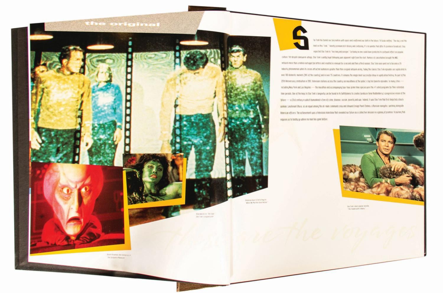 (Paramount, 1992) An extremely rare promotional book released prior to the first season of Star Trek: Deep Space Nine. This book comes from the collection of Bill Wallen, who helped create promotional and advertising campaigns for the franchise. The book covers the first two series, the movies, home video, merchandising, publishing, promotions, and the fans, before introducing the franchise's next show. Measuring 15"x13.5", the book is in very good condition with minimal edge-wear.