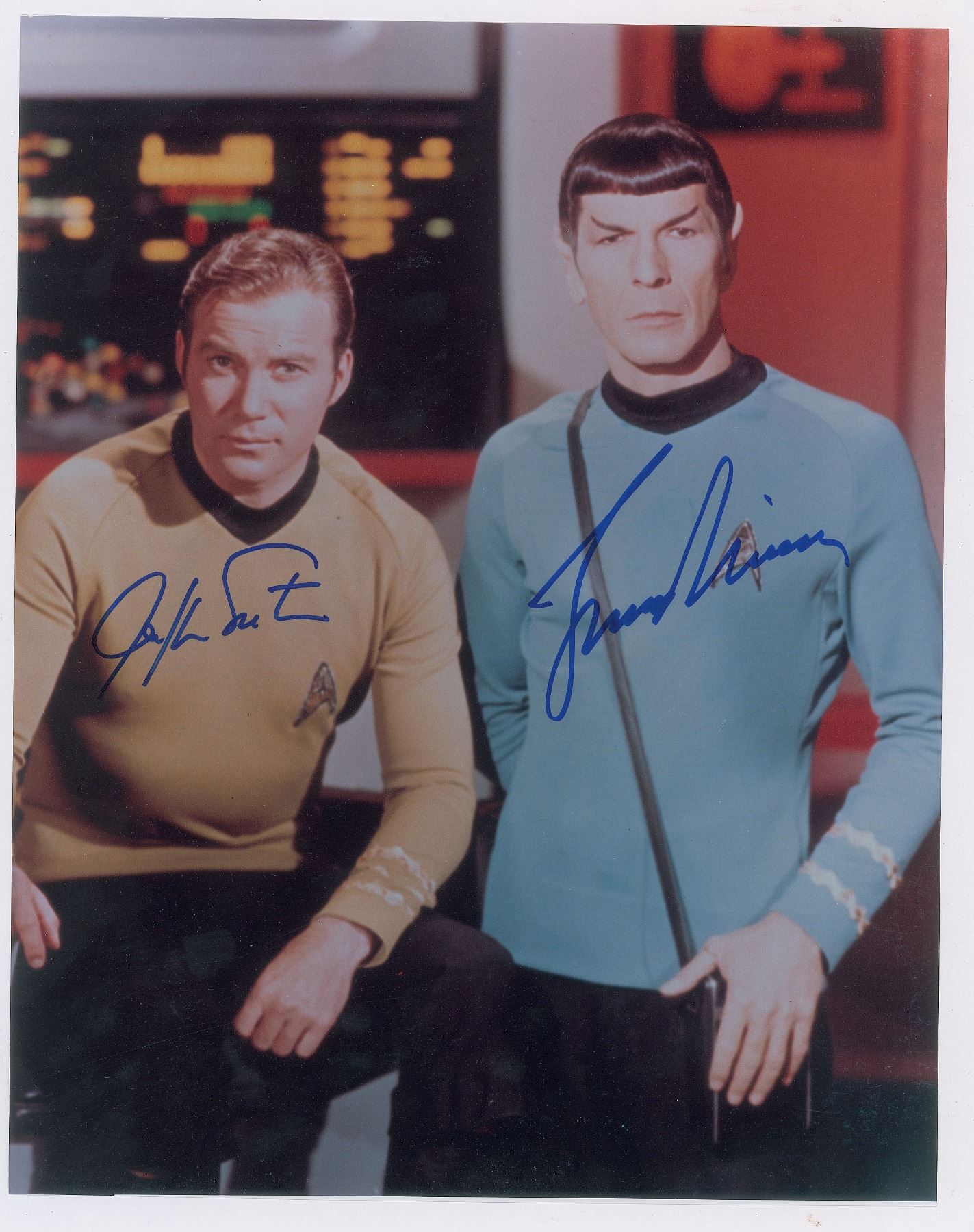 Color satin-finish 11 x 14 photo of Captain Kirk and Mr. Spock from the Star Trek television series, signed in blue felt tip by William Shatner and Leonard Nimoy. In fine condition. Originally obtained by in-person specialist Mike Wehrmann.