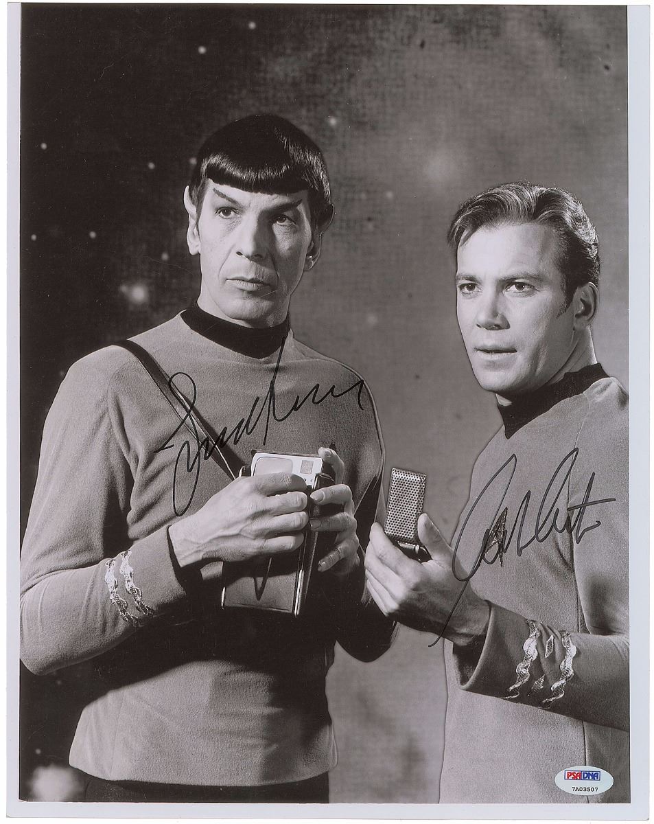 Satin-finish 11 x 14 photo of Captain Kirk and Mr. Spock, signed in black felt tip by William Shatner and Leonard Nimoy. In fine condition, with an evenly trimmed top edge and a PSA/DNA label affixed to lower right corner. Accompanied by a certificate of authenticity from PSA/DNA.