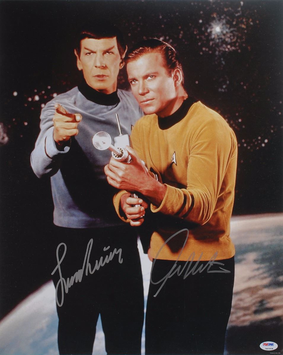 Color semi-glossy 16 x 20 cardstock photo of Captain Kirk and Mr. Spock, signed in silver ink by William Shatner and Leonard Nimoy. In fine condition. Accompanied by a certificate of authenticity from PSA/DNA.