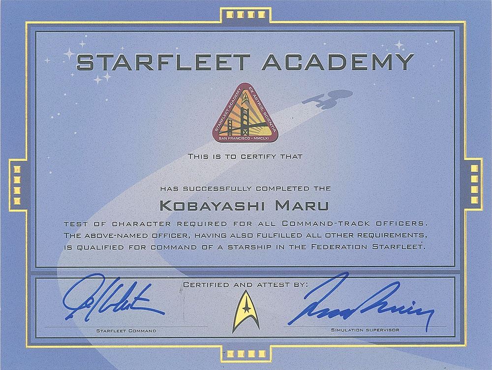 Unissued Starfleet Academy certificate, one page, 12 x 9, signed below in blue felt tip by William Shatner and Leonard Nimoy. The certificate is given upon the successful completion of the "Kobayashi Maru test of character required for all Command-track Officers." In very fine condition. Accompanied by a full letter of authenticity from PSA/DNA.