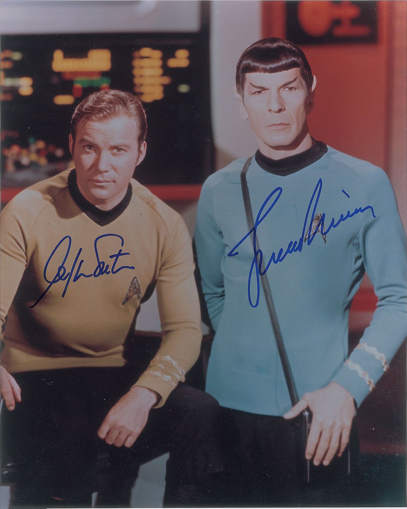 Color satin-finish 11 x 14 photo of Captain Kirk and Mr. Spock, signed in blue felt tip by William Shatner and Leonard Nimoy. In very fine condition. Originally obtained by in-person specialist Mike Wehrmann.