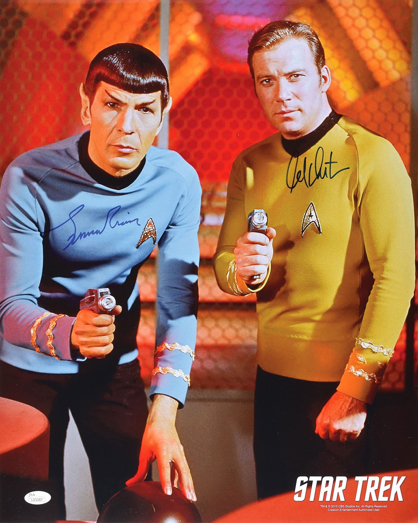 Color glossy 16 x 20 photo of Spock standing beside an armed Captain Kirk, signed in black felt tip by William Shatner and in blue felt tip by Leonard Nimoy. In fine condition, with a JSA label affixed to lower left corner. Accompanied by a certificate of authenticity from JSA.
