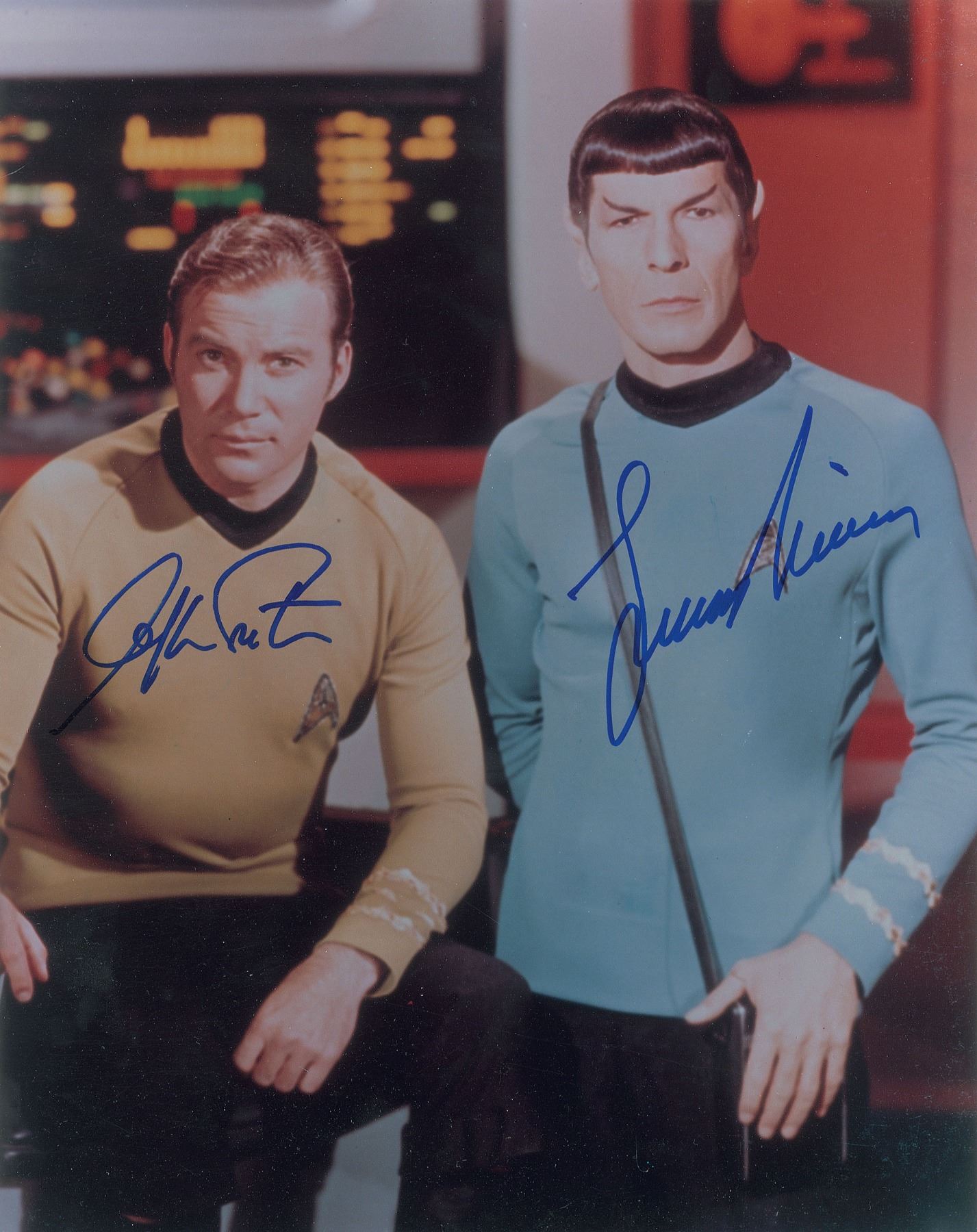 Color satin-finish 11 x 14 photo of Captain Kirk and Mr. Spock from the Star Trek television series, signed in blue felt tip by William Shatner and Leonard Nimoy. In very fine condition. Originally obtained by in-person specialist Mike Wehrmann.