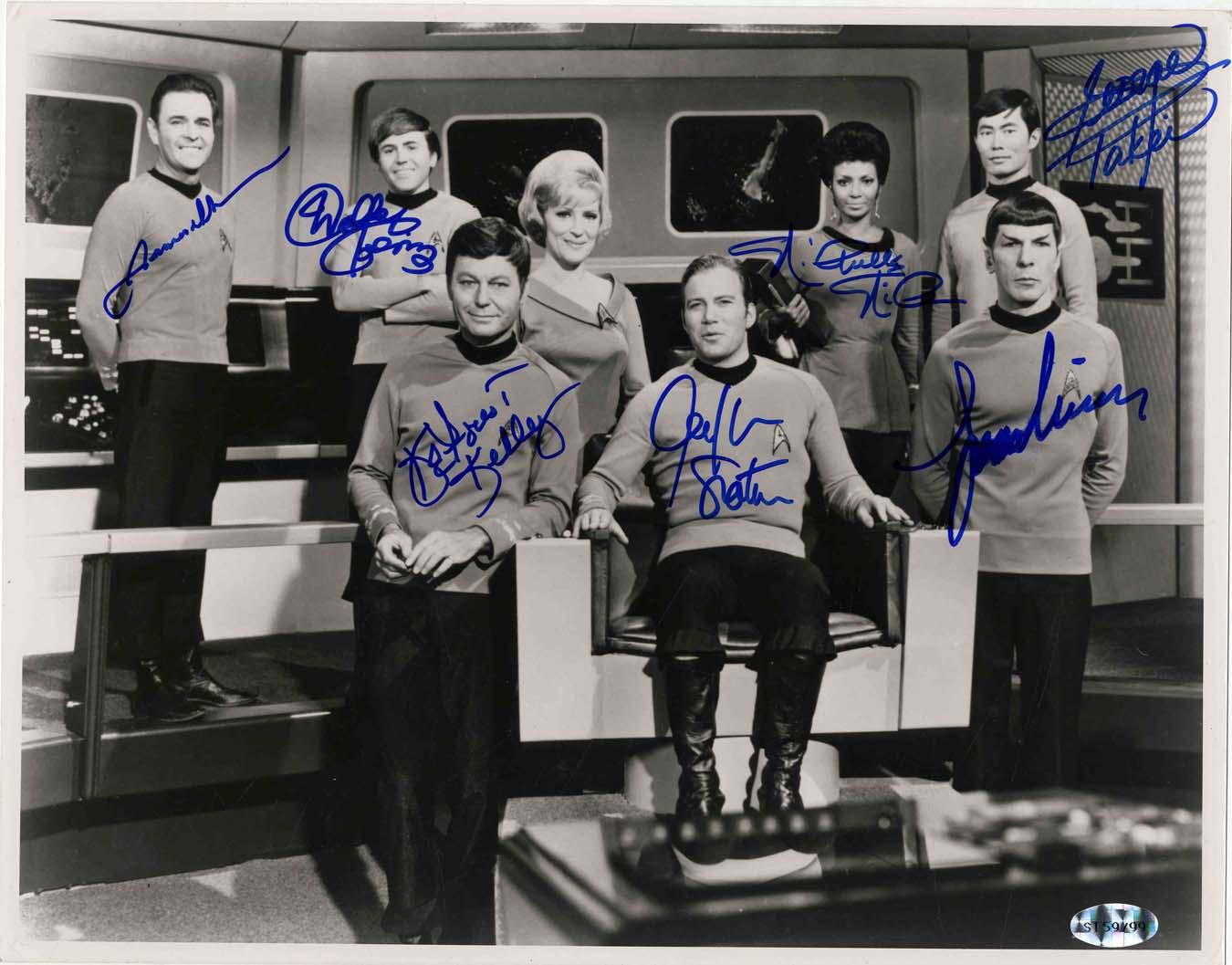Large 14'' x 11'' photo signed by seven members of the original Star Trek TV series. Signed in blue marker by James Doohan, Walter Koenig, Nichelle Nichols, George Takei, DeForest Kelley, William Shatner and Leonard Nimoy. Black and white glossy photo is in near fine condition. Obtained by noted in person autograph collector Michael Wehrmann.