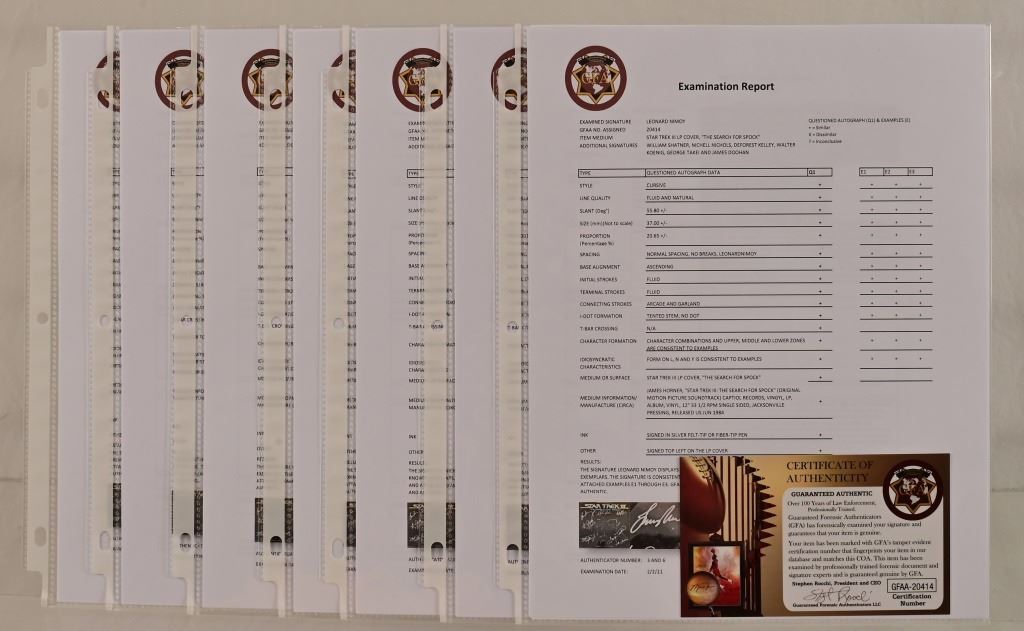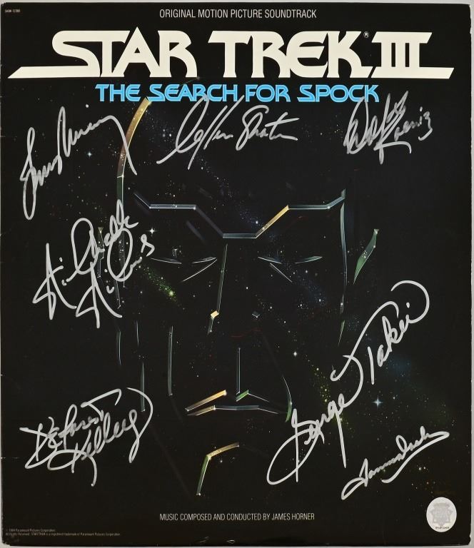 1984 original music to the motion picture "Star Trek III: The Search For Spock" autographed by Leonard Nimoy, George Takei, William Shatner, DeForest Kelley, James Doohan, Walter Koenig and Nichelle Nichols. GFA Authenticated. 12x12 inches. PSJ7