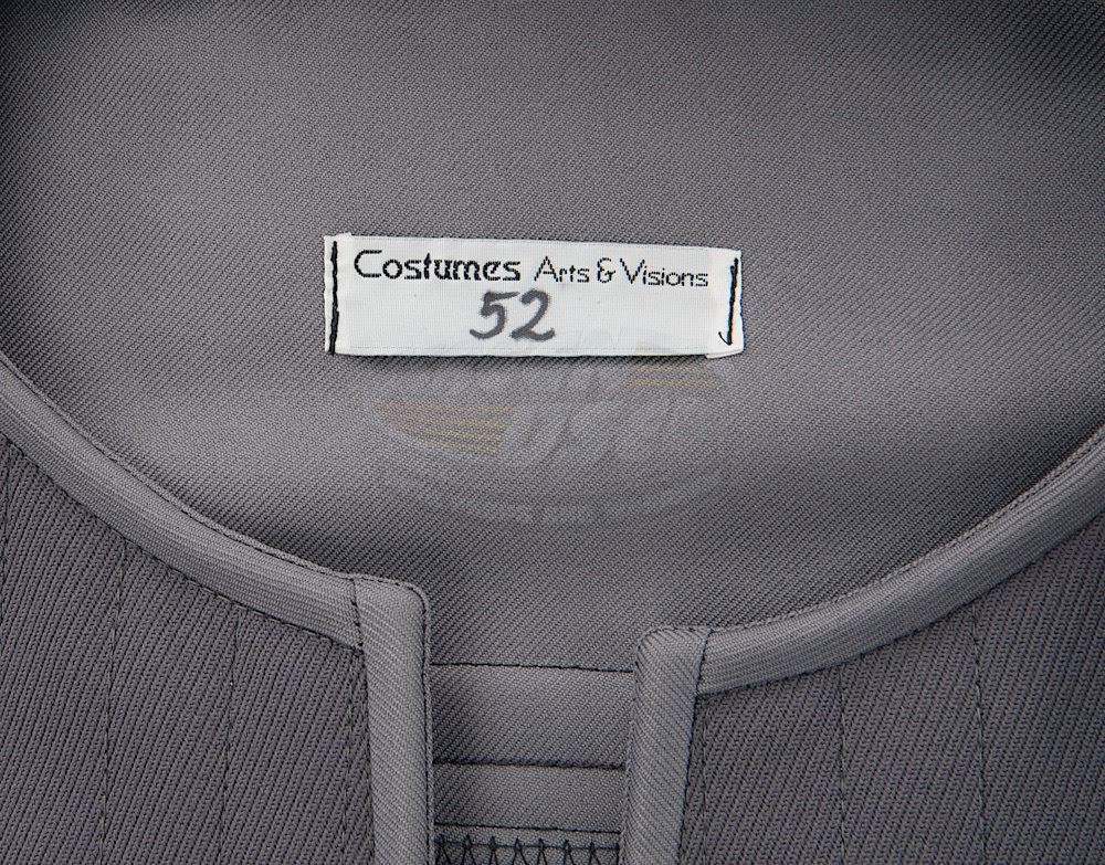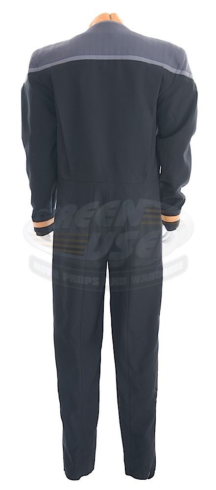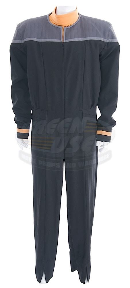 This black and gray Starfleet style jumpsuit uniform with gold colored under-tunic was custom-made for use by members of the Space Center in Bremen, Germany. This style Starfleet jumpsuit with characteristic gray quilted shoulders was designed to resemble the style seen in Star Trek VIII: First Contact, Star Trek IX: Insurrection and Star Trek X: Nemesis. This uniform features an operations gold undershirt that zips up the front and the black and gray jumpsuit with gold cuff trim and front zipper closure. The uniform has "52" written on the inside and has no size marked, but appears to be a size large.