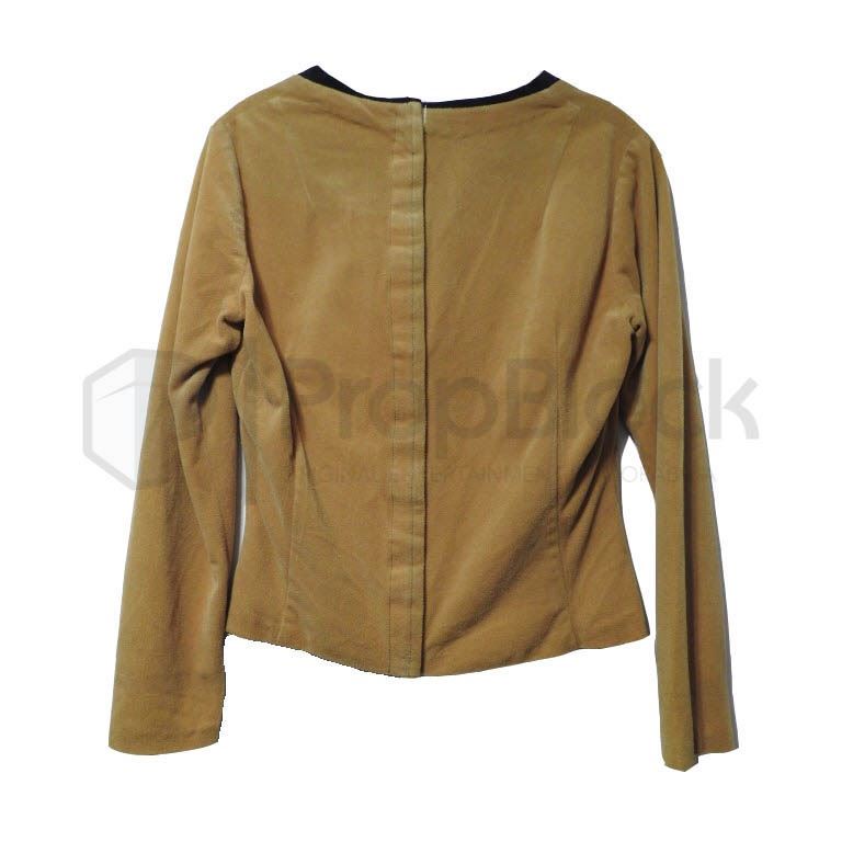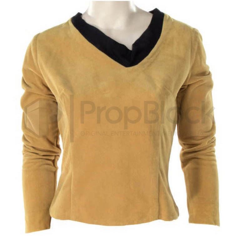 An exceptionally rare and possibly unique female Starfleet command tunic worn by actress Majel Barrett in her co-starring role as Number One in the first filmed Star Trek pilot episode The Cage, which underwent principal photography during the months of November and December, 1964. The main tunic is comprised of gold velour fabric fitted with a black cotton collar and features clear indentations on the sleeves where gold rank braid was once mounted (currently not present). As Majel Barrett was the only actress in “The Cage” to feature rank braid on her Starfleet tunic, the evidence of past braid on this costume is a key element in identifying the tunic as being worn by Barrett. Additionally, both the location of the braid indentations fairly well up from the end of the sleeves, as well as the noticeably left-side shifted, off-center placement of the full body-length Velcro strip closure on the back of this tunic stunningly matches the characteristics of the costume seen on Majel Barrett in the opening scenes of the “The Cage”. (Please view the attached screenshot imagery and costume photos.) The black collar on this tunic is a modification that was made by the production team after the filming of the pilot was completed, in order that the costume might be used in regular season episodes. It is noted that a female tunic which appears to have this same configuration can be discerned in a background corridor scene during the 1st season TOS episode “The Corbomite Maneuver”, being worn by an actress that might possibly be Majel Barrett herself in a brief cameo appearance. (Please view the attached screenshot.) While lacking its original Starfleet chest insignia, this historic garment is in very fine production used condition and worthy of the finest Star Trek memorabilia collections. This is the first time we are aware of an identified Majel Barrett “Number One” costume ever being offered at auction.