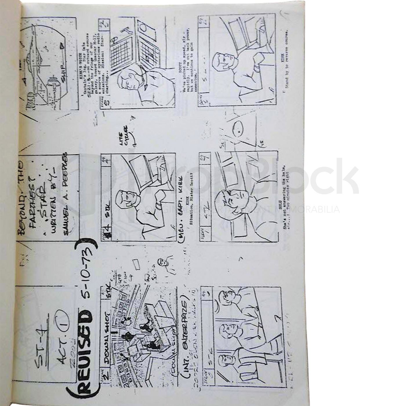 An original production used 49 page, white covered set of storyboards for the TAS episode "Beyond The Farthest Star", in fine condition with no handwriting/markings on its internal pages and bearing the handwritten distribution copy number 21 in the upper right corner of the front cover. A rarely seen memento of the brief 22 episode Star Trek Animated Series that was broadcast on NBC between September,1973 and October, 1974.