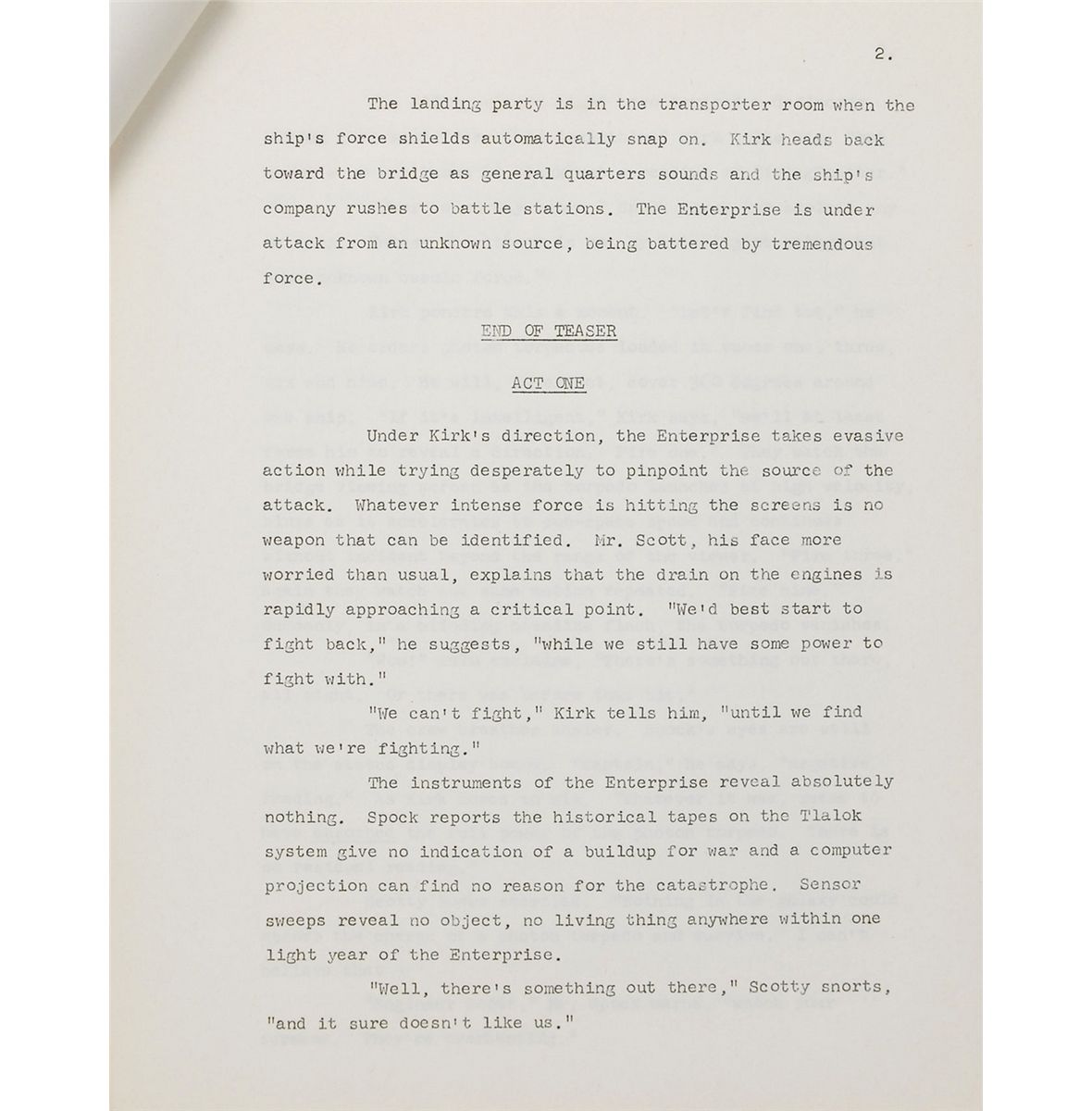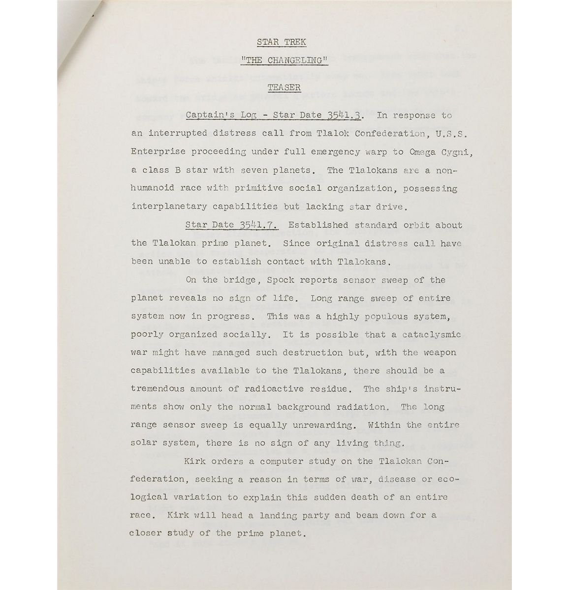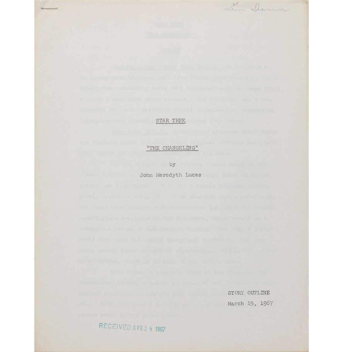 Rare original story outline for the Star Trek Season Two episode entitled “The Changeling,” belonging to Linwood Dunn, 8.5 x 11, 30 pages, written by John Meredyth Lucas, and headed at the bottom of the cover page, “Story Outline, March 15, 1967.” Dunn’s name is written at the top of the cover page, with a green received stamp at the bottom dated April 24, 1967. In fine condition. This story contains similarities that would be seen again in the 1979 full-length motion picture. A lengthy and very detailed outline from one of the few episodes that takes place entirely on board the Enterprise.