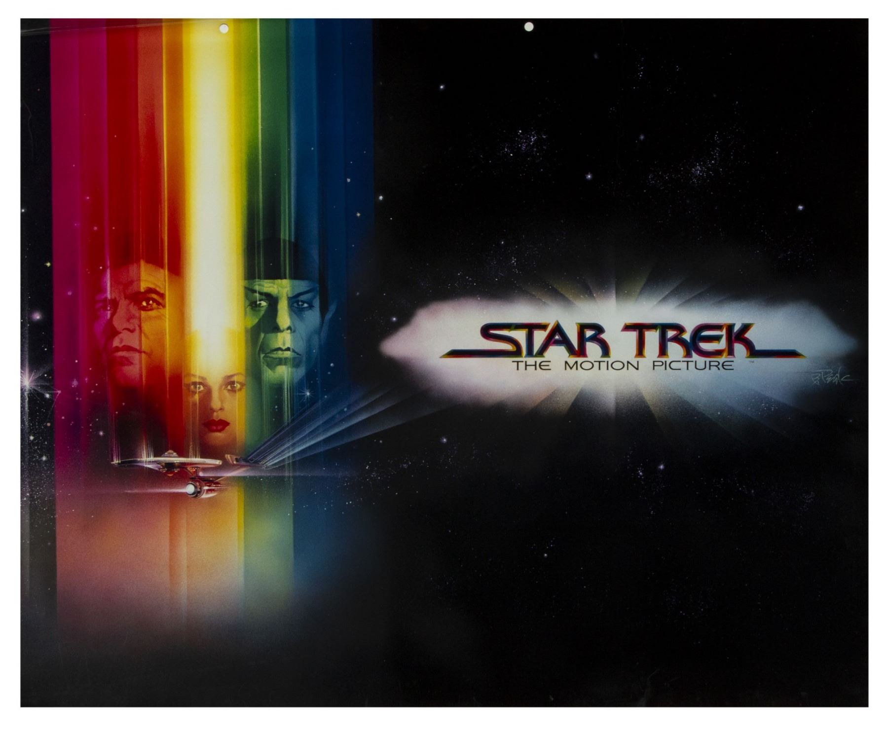 (Paramount, 1979) A large high-quality print of Bob Peak's poster artwork for "Star Trek: The Motion Picture" that has several original airbrushed enhancements. From the collection of Bill Wallen, this artwork was created to help promote the theatrical release of the film. The most noticeable portions of original airbrush are around the "Star Trek: The Motion Picture" text, and in the color under the Starship Enterprise. The artwork has an image size of 20"x24" and is adhered to a 22"x28" board. The condition is fair to good with some surface wear to the bottom edge of the image, some wear around the edges of the art board backing, and some tearing within the protective clear sheet that is hinged over the artwork. The airbrushed photo artwork is also lifting slightly around the edges from the backing.