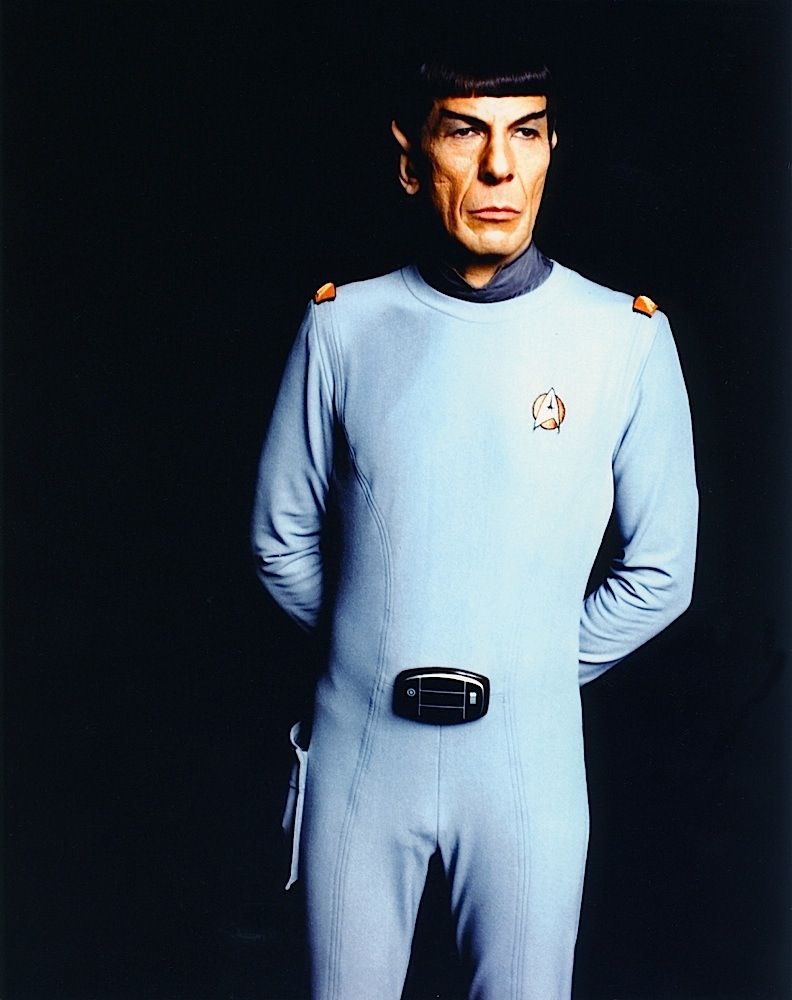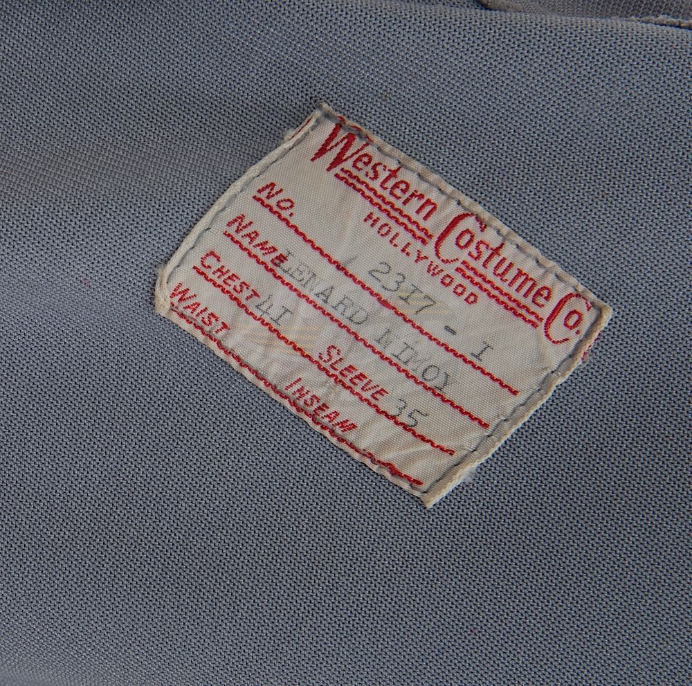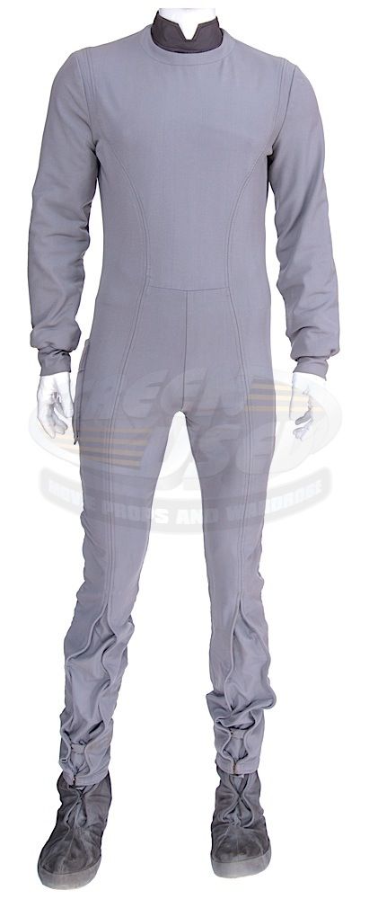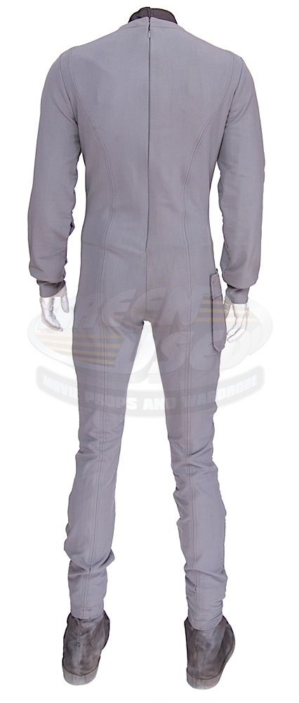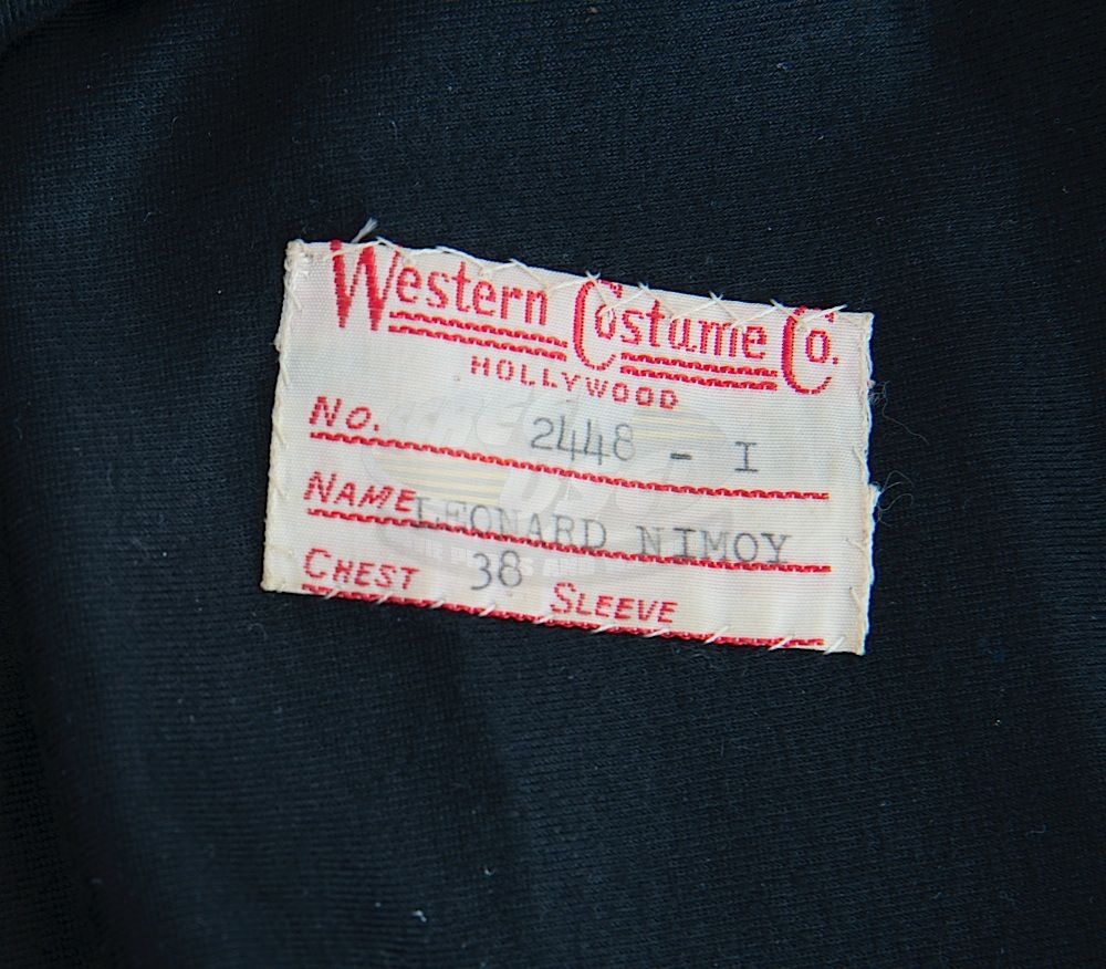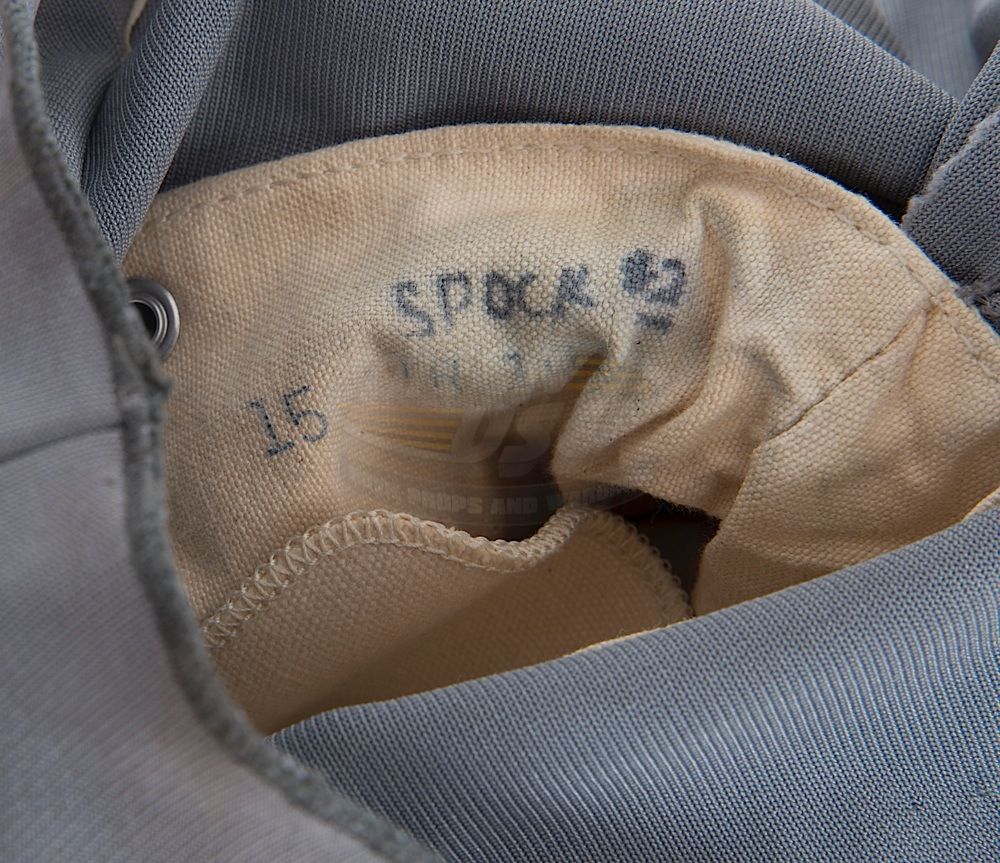 (Paramount, 1979) This Class "D" Starfleet Uniform was custom-made by Western Costume Company for use by Leonard Nimoy as "Spock". The uniform consists of a gray jumpsuit with a pocket on the right leg, a dark gray sleeveless under shirt, a pair of cloth covered shoes and an unattached bio-monitor. Western Costume Company tags with "Leonard Nimoy" typed on the information line are sewn into the jumpsuit and under shirt. The shoes are stained and each have "Spock" written on the inside. In addition to being used during filming, Leonard Nimoy is seen wearing this style uniform in many publicity photos for the film.
