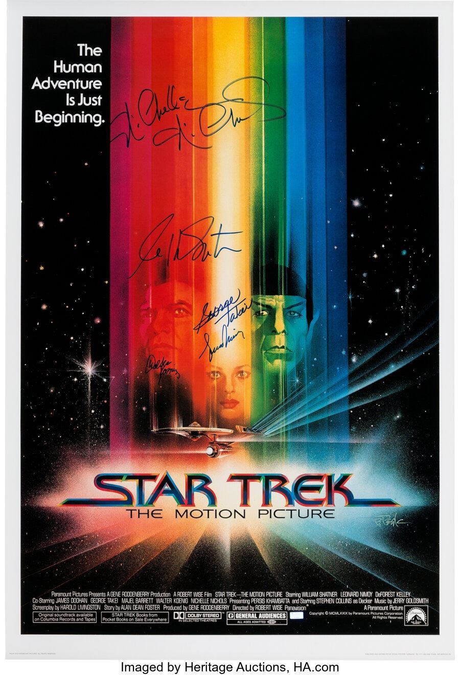 Star Trek: The Motion PictureTheatrical One-Sheet Signed by Main Cast. A modern replication of the original Star Trek: The Motion Pictureone-sheet, signed by five main cast members, each with a blue felt tip. Signatures include: William Shatner, Leonard Nimoy, George Takei, Walter Koenig, and Nichelle Nichols. Comes with a sticker from Celebrity Authentics, and a COA card for each signature (featuring a picture of each person signing the poster). Measures 27" x 40". In Near Mint Minus condition with light handling wear and edge wear. COA from Heritage Auctions.