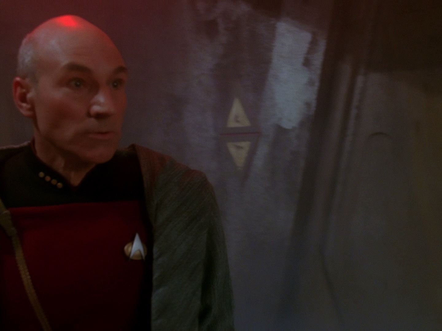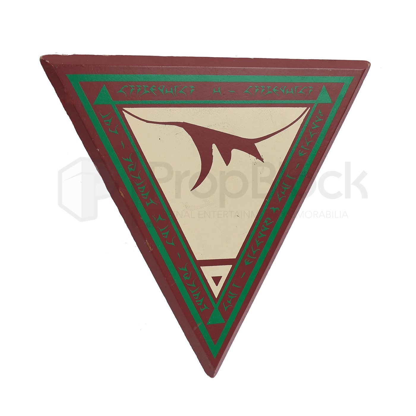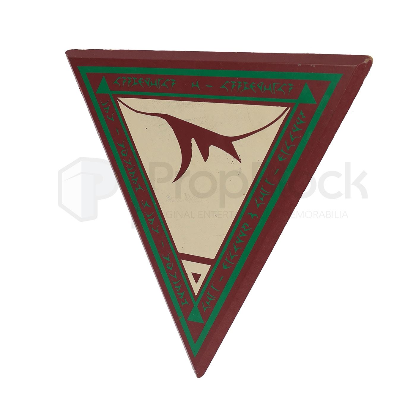 Triangular Klingon sign used in the production of the 1988 science fiction series Star Trek: The Next Generation. Featuring a bigger and better USS Enterprise, this series is set 78 years after the original series -- in the 24th century. Instead of Capt. James Kirk, a less volatile and more mature Capt. Jean-Luc Picard heads the crew of various humans and alien creatures in their adventures in space -- the final frontier. This signage can be seen in the fan favorite episode "Sins of the Father" and was created as set dec. made of MDF, this piece feartures a triangular shape and is red inc color with printed graphics attached to the front. This piece shows very minimal wear from sue in the episode and remaisn in excellent, production used condition.