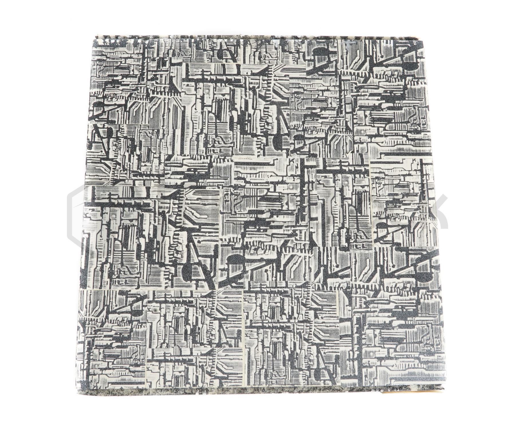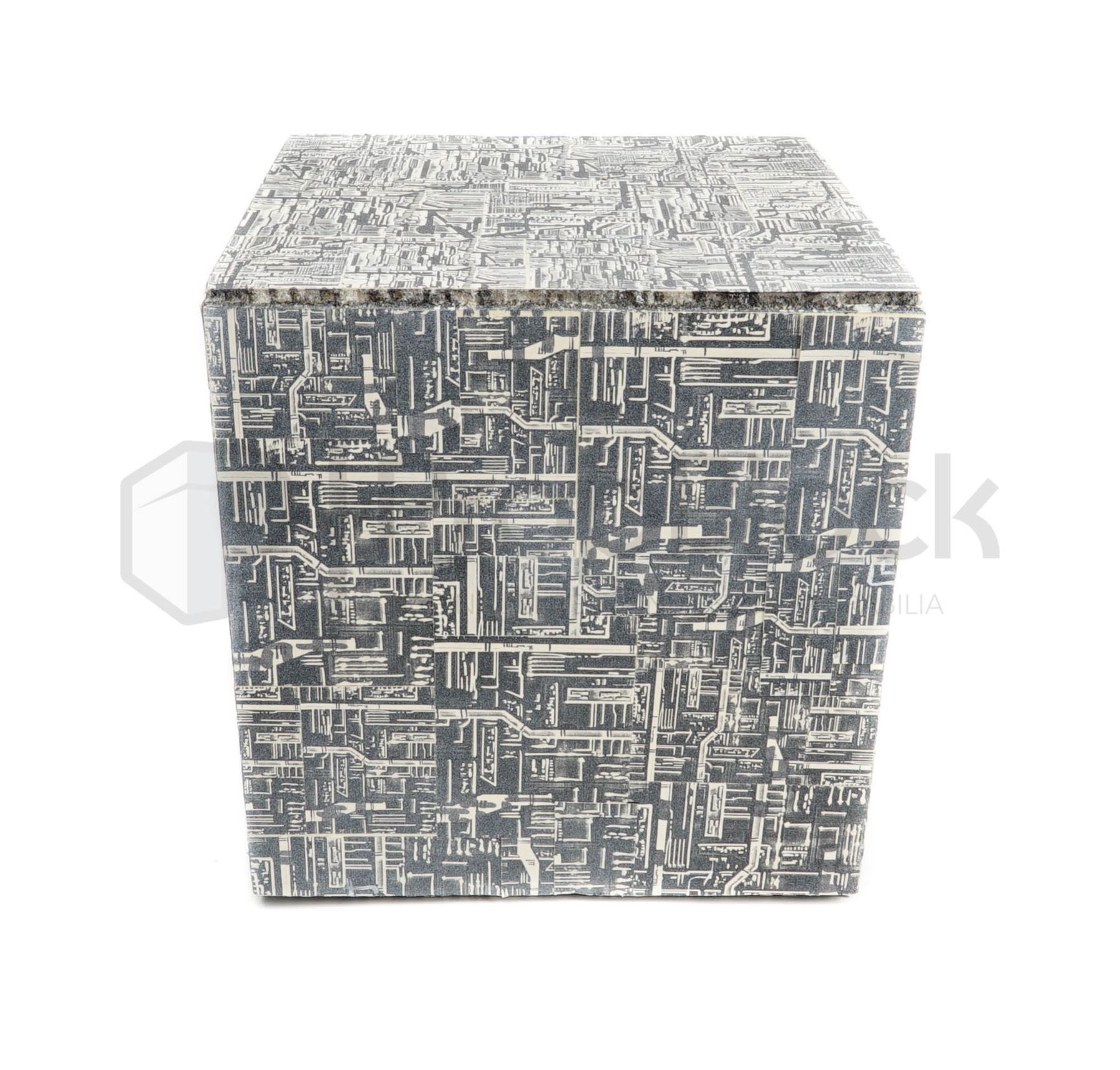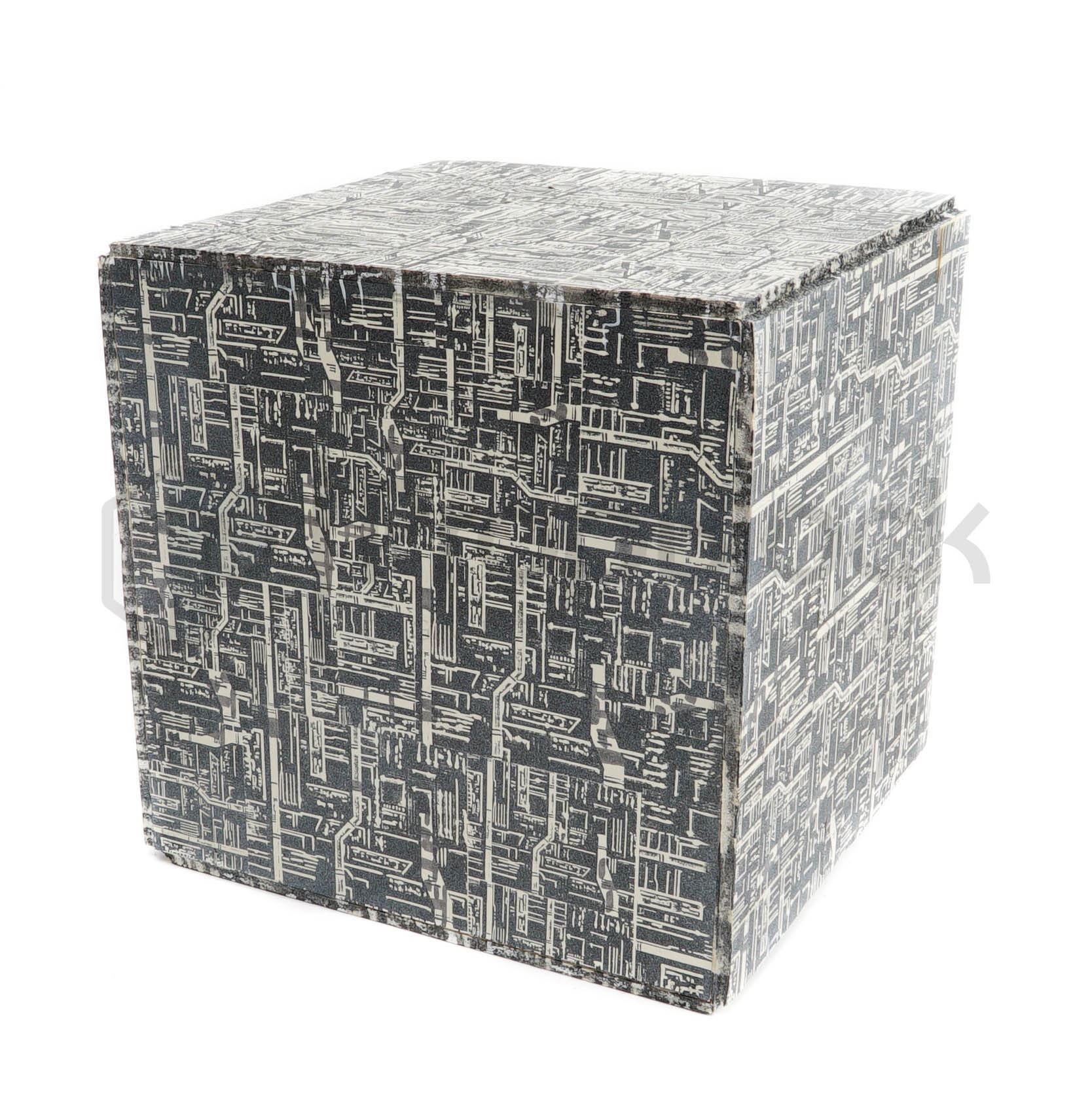 Study model of the Borg cube used in the production of Star Trek: The Next Generation. These study models were used by the production to design different scenes for filming. This piece is made of white particle board with glued on paper accents. This item measures around 12" x 12" x 12" and remains in excellent, production used condition.
