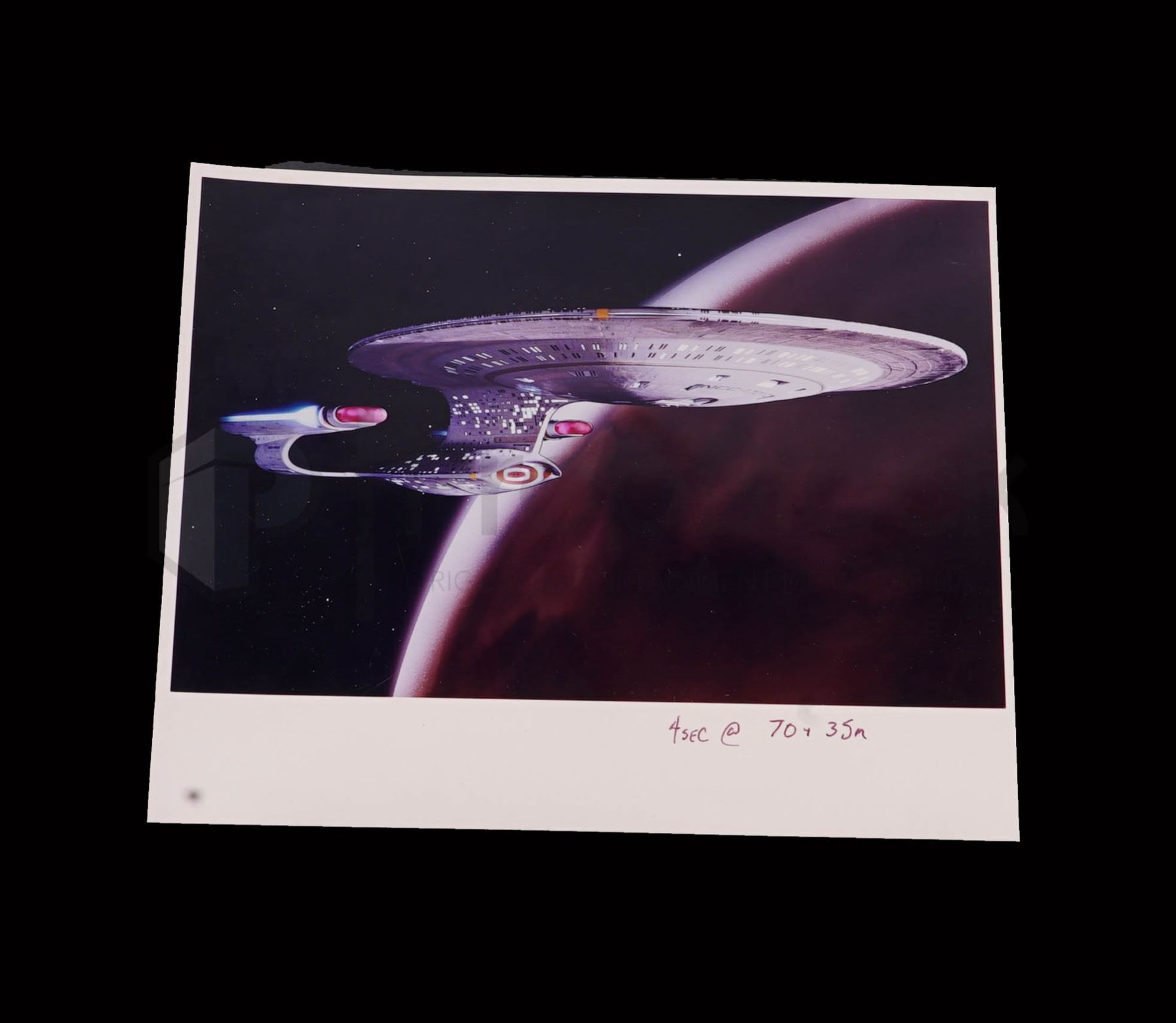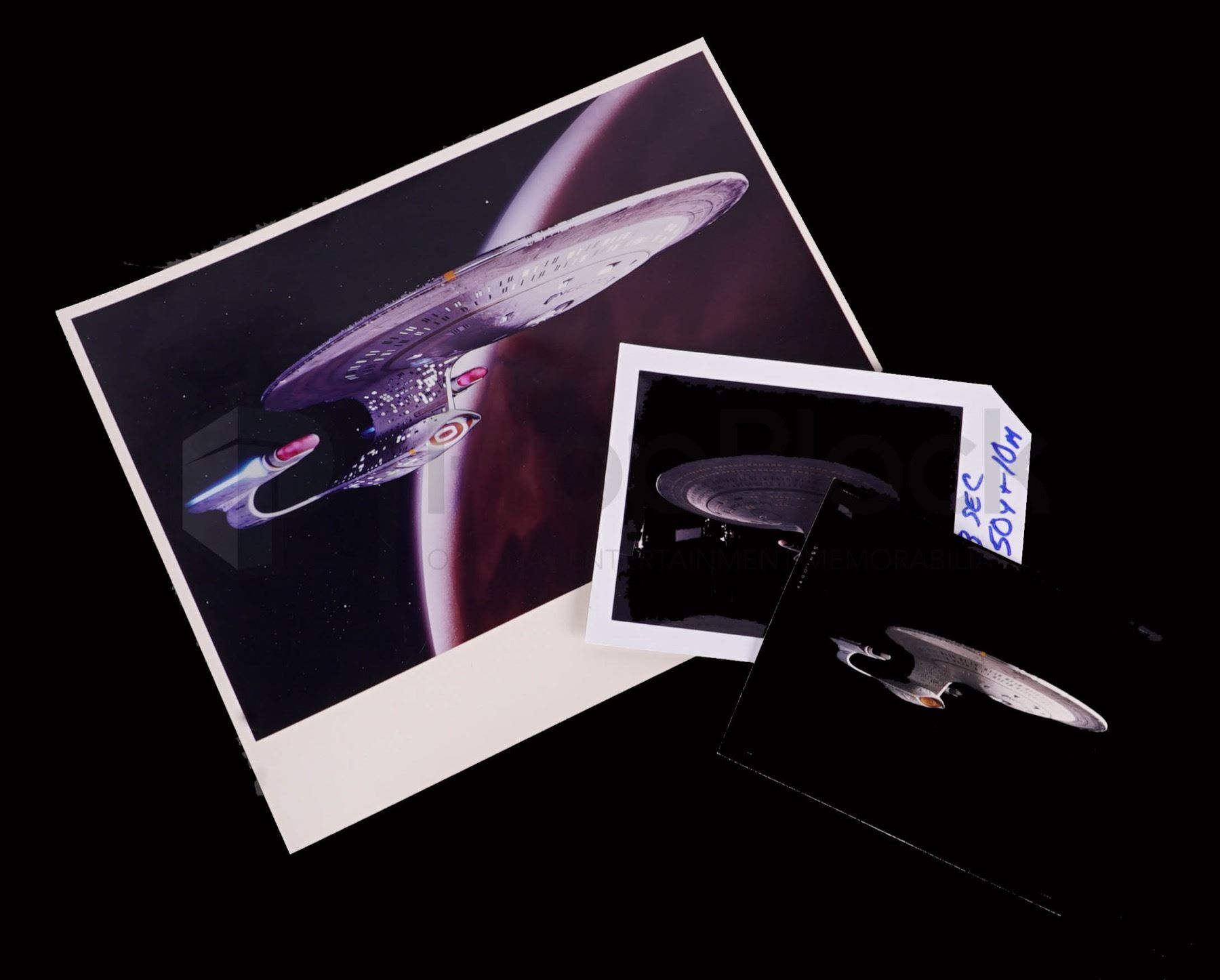 A selection of production material featuring images of the Enterprise-D filming model from Star Trek: The Next Generation. This set features an 8x10 glossy photograph of the ship as seen in the final cut of the show, a printed photo negative with white border of the ship lighted while being filmed and a printed color photograph of a film negative featuring an unlighted "pass" of the ship. Each item remains in excellent, production used condition.