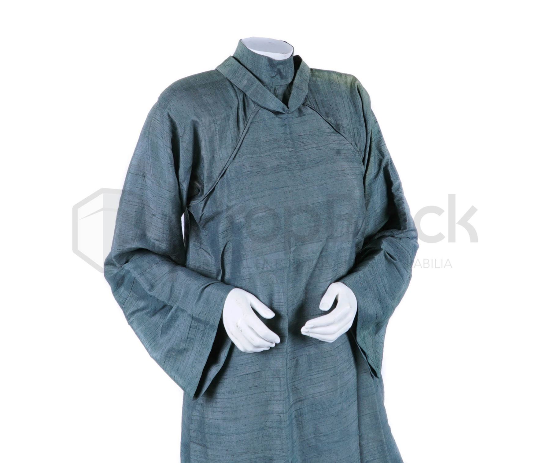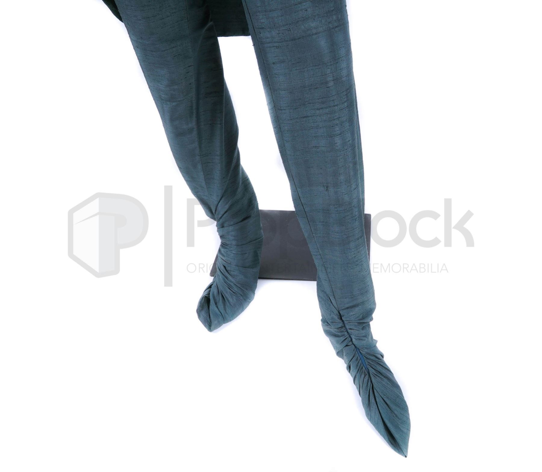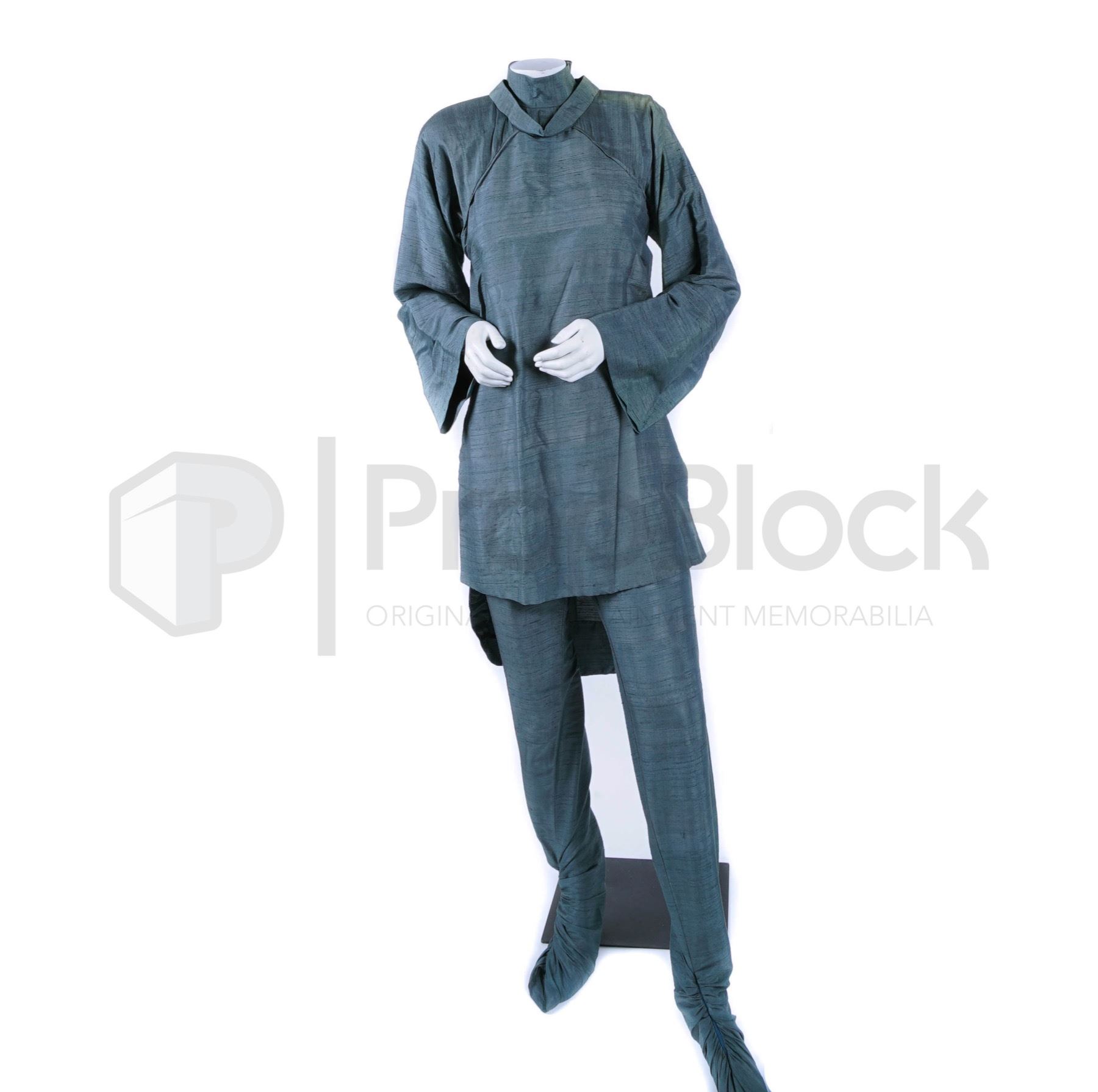 Green leisure style outfit worn by the character of Guinan, award winning actress Whoopie Goldberg in her first appearance as the fan favorite character in Star Trek: The Next Generation. Guinan was the mysterious bartender, who was introduced in the first episode of the second season entitled “The Child”, where this costume first appeared. The outfit consists of a long sleeved tunic with hidden zipper on the back and attached shoulder pads. Included are a pair of matching trousers that feature an elastic waistband and attached foot covers. The ensemble is completed by a black satin and spandex signature hat. This piece was custom made by the production for use on set and was made to the actresses measurements, so no size is indicated. This piece remains in excellent, production used