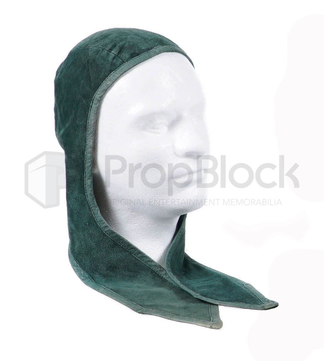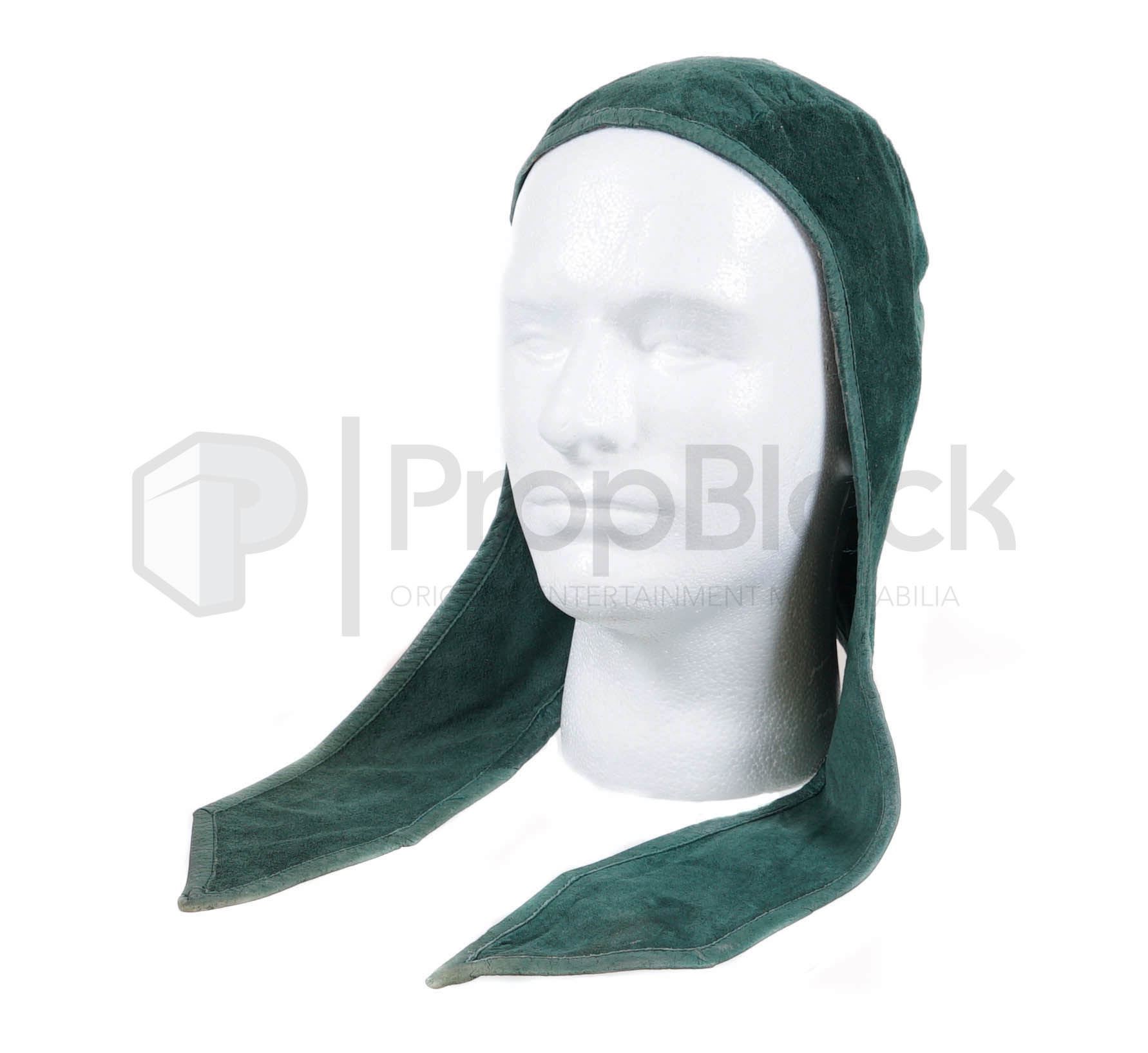 Green hood worn by the J’Nail guards in the Star Trek: The Next Generation fifth season episode “Outcast”. When Commander Riker falls in love with Soren, a member of an androgynous race known as the J’naii, it disrupts the entire race’s way of life. This green colored hood is made of a canvas material with two long straps protruding off each side. Item features a rectangular white label inside with the names “Giffon, D. Dilly” and remains in excellent, screen used condition.