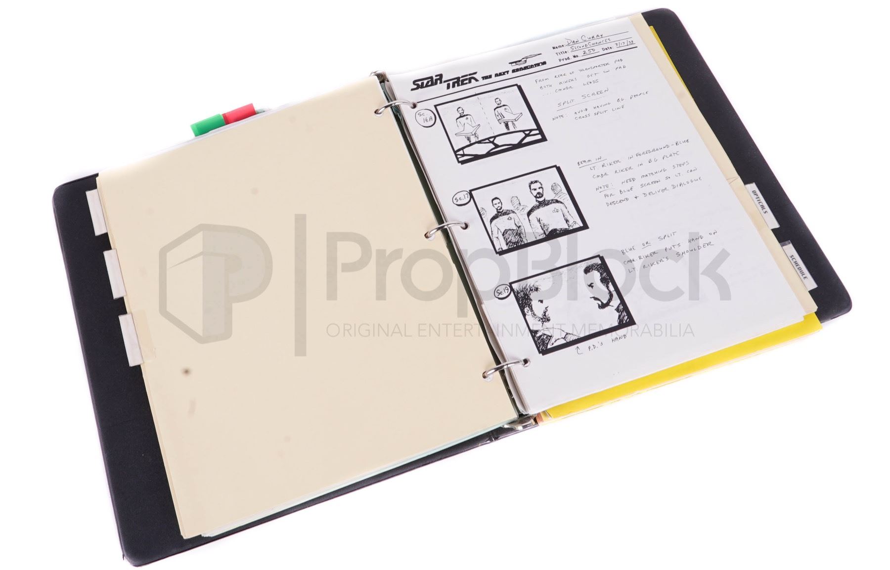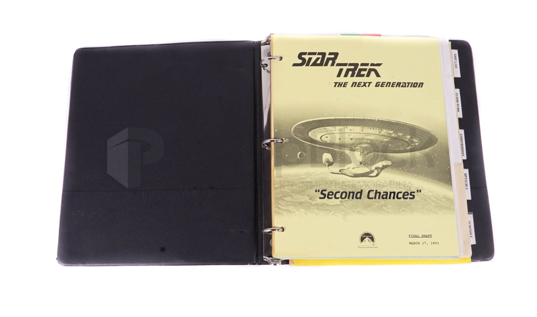 A collection of production material used in the filming of the Star Trek: The Next Generation episode "Second Chances". This binder which belonged to Levar Burton, who directed the episode contains various material such as a first and second draft of the script, storyboards and scene layouts, along with various other pages used by the director. This piece comes from the collection of Levar Burton and remains in excellent condition.