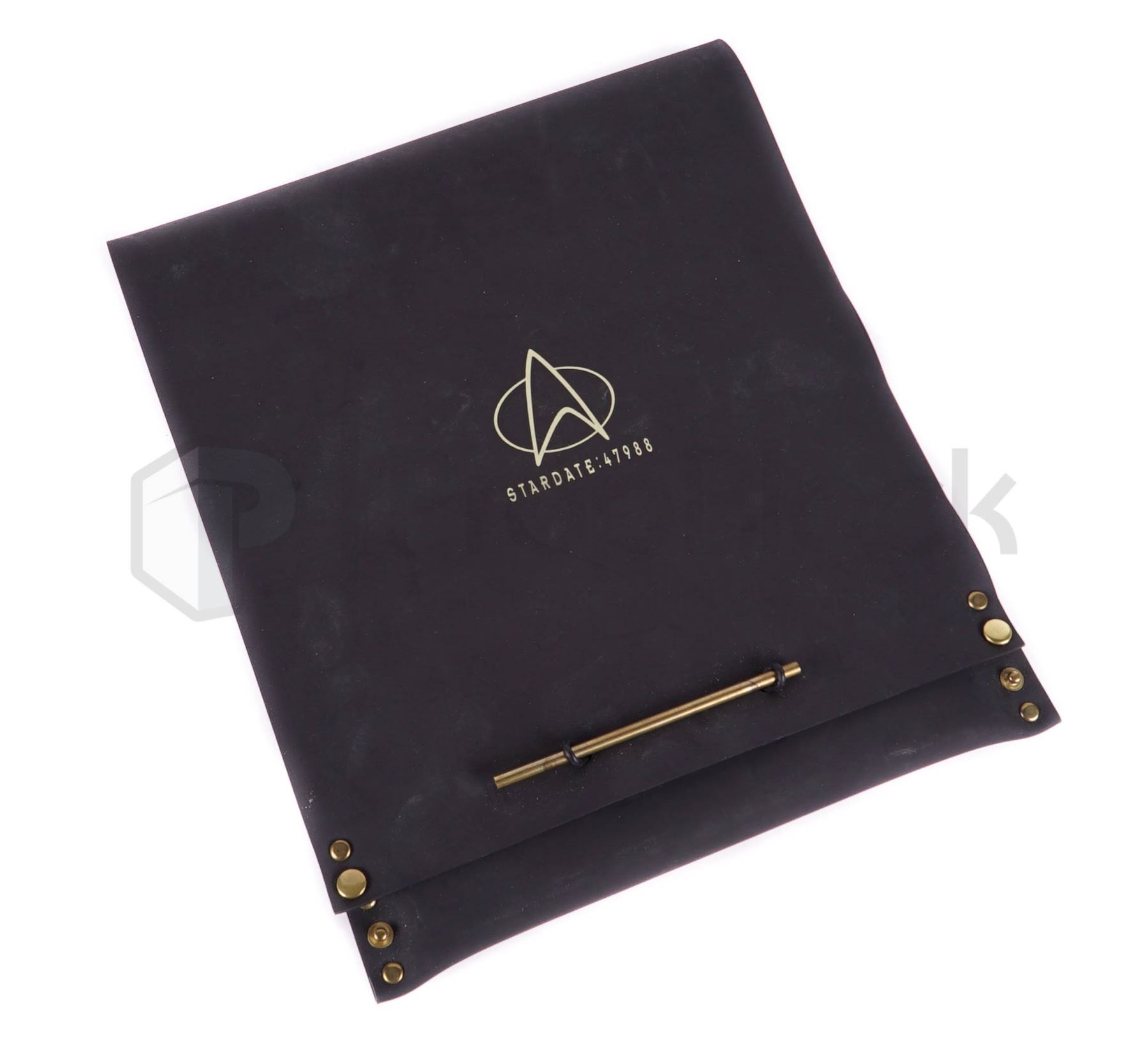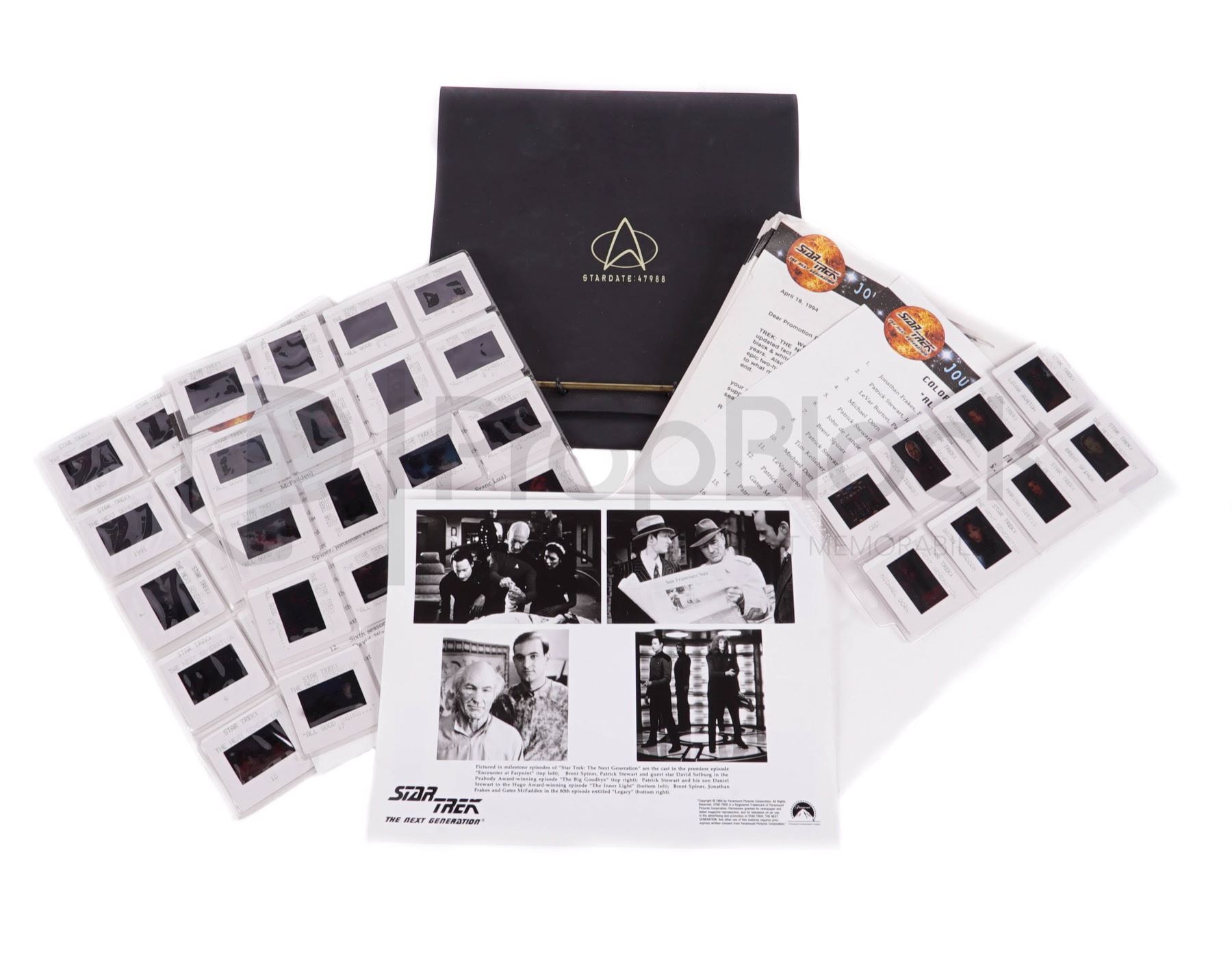 Press kit for the Star Trek: The Next Generation finale episode "All Good Things". This kit was given out to members of the press to advertise the series finale. Consisting of a black rubber folder with flip open top and bbrass details, this piece includes selected material inside such as sheets of slides from the finale, 8x10 glossy photographs from TNG and breakdowns of the series. This set remains in excellent, production made condition.