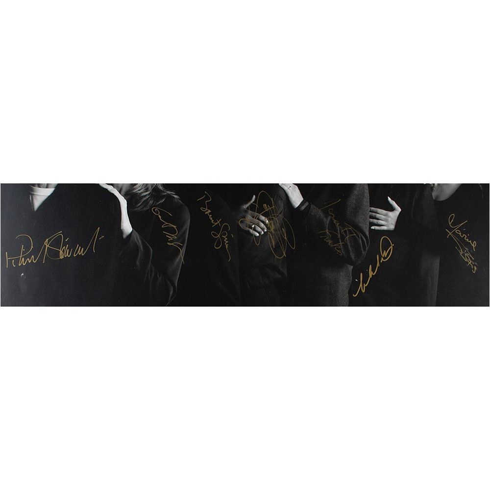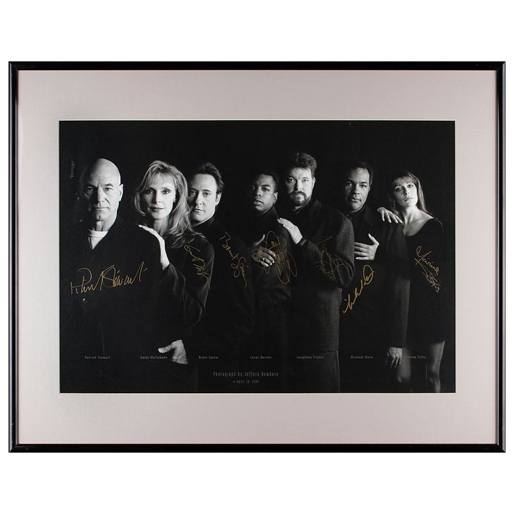 Superb 22.25 x 15.25 print of a 1994 photograph of the cast of Star Trek: The Next Generation by Jeffery Newbury, signed in gold ink by Patrick Stewart, Gates McFadden, Brent Spiner, Levar Burton, Jonathan Frakes, Michael Dorn, and Marina Sirtis. Nicely matted and framed to an overall size of 28 x 22. In fine condition.