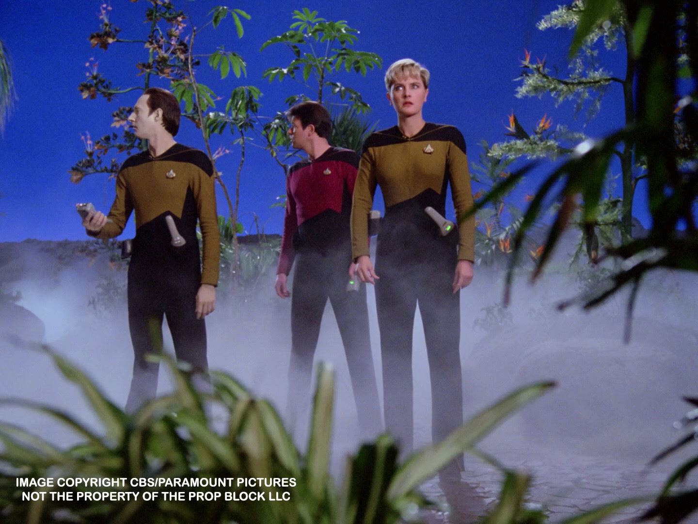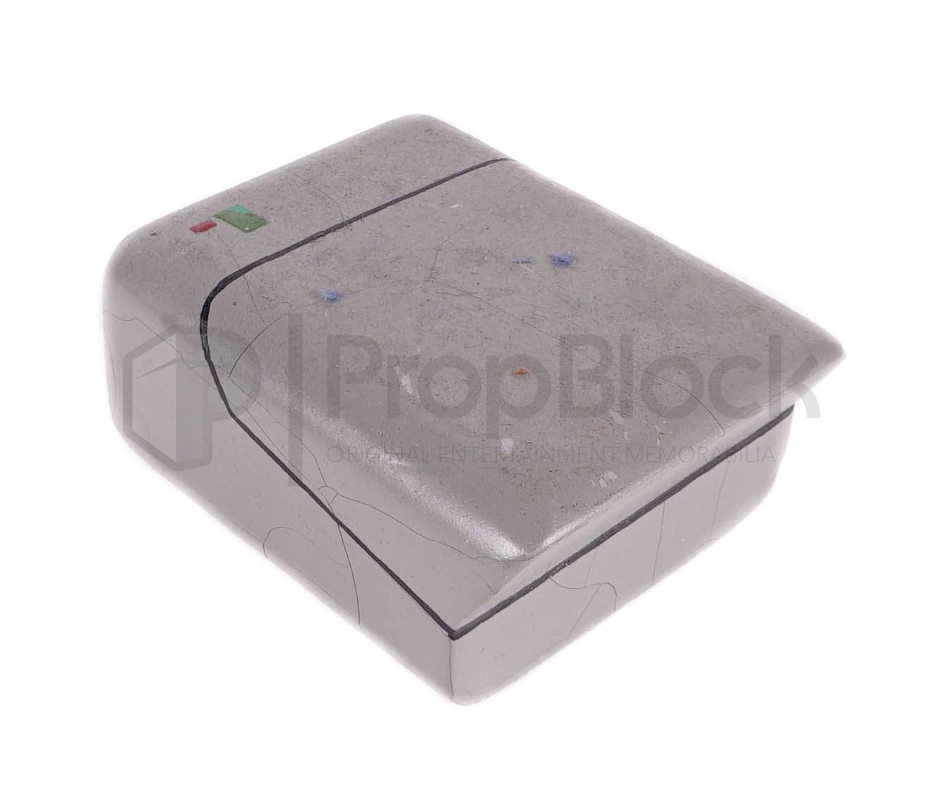 Stunt version of the Mark V tricorder featured in the production of Star Trek: The Next Generation. This piece was used to fit inside the holster on the Next Generation uniforms where a functioning prop would not be needed. Made of lightweight foam, this piece has been painted a light grey with green details and shows signs of wear from over the years in the from of scuffs on the front and slight cracking in the paint throughout. This piece comes from the collection of the Star Trek prop master Joe Longo and remains in good production used condition.