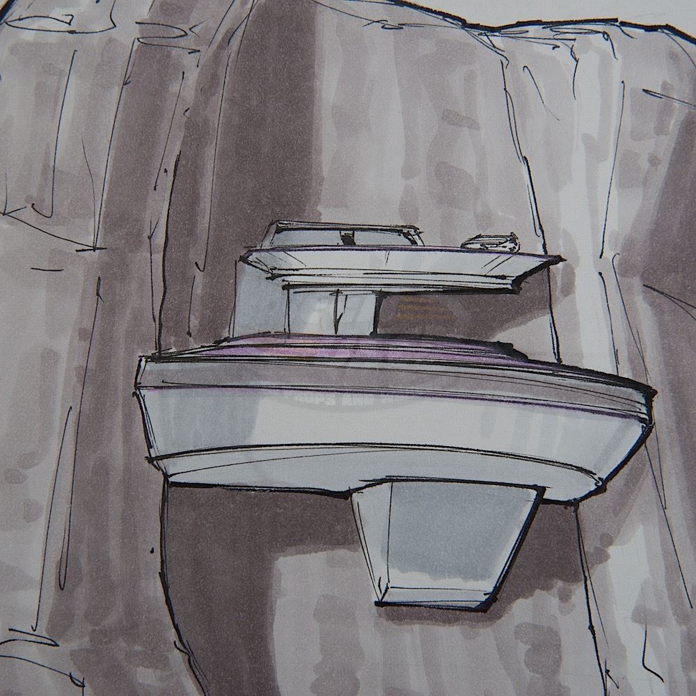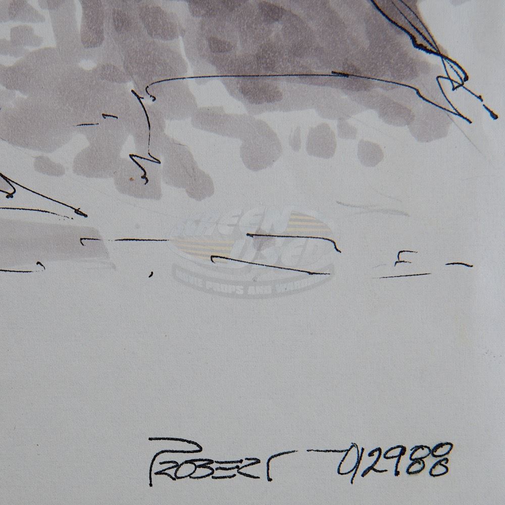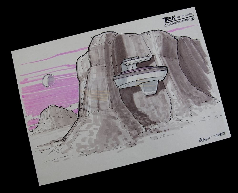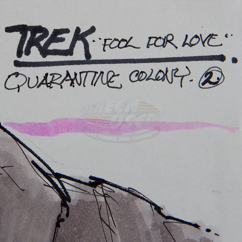 (Paramount-TV, 1987-94) This original production art by consulting senior illustrator Andrew Probert is titled "Fool for Love", 'Quarantine Colony'. The art is done in pen and color marker, measuring 8.25" X 11.25", of an alien world and cliff design for a quarantine colony, signed "Probert", 1/29/88.